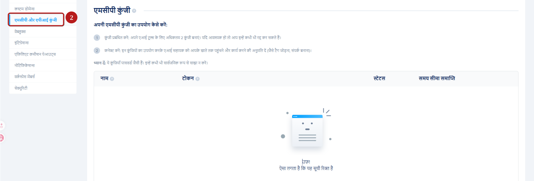 बाएं मेनू में, MCP और API कुंजियों (2) पर क्लिक करें।