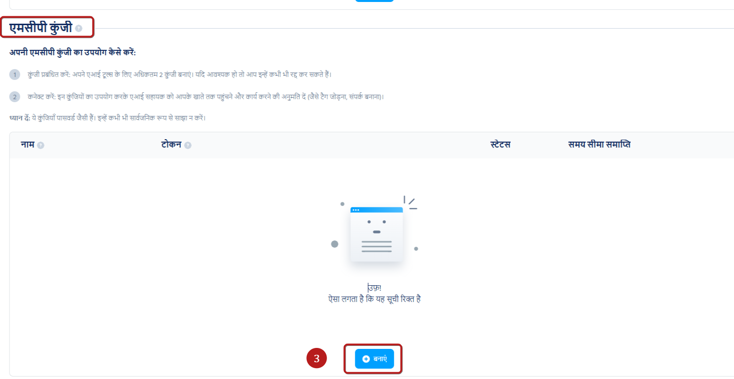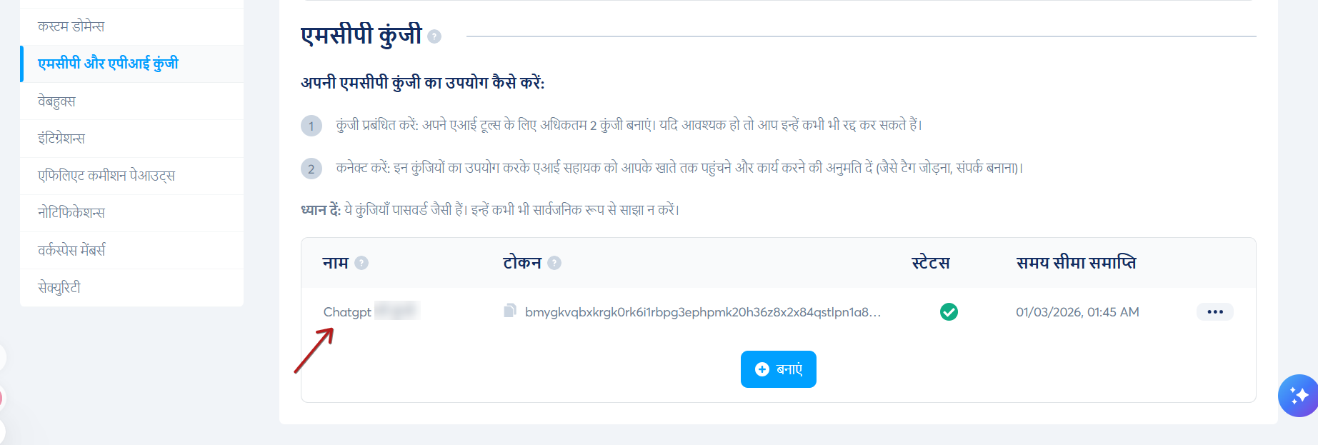 AI टूल को कनेक्ट करने के लिए, आपको सबसे पहले एक सुरक्षित MCP कुंजी जनरेट करनी होगी।