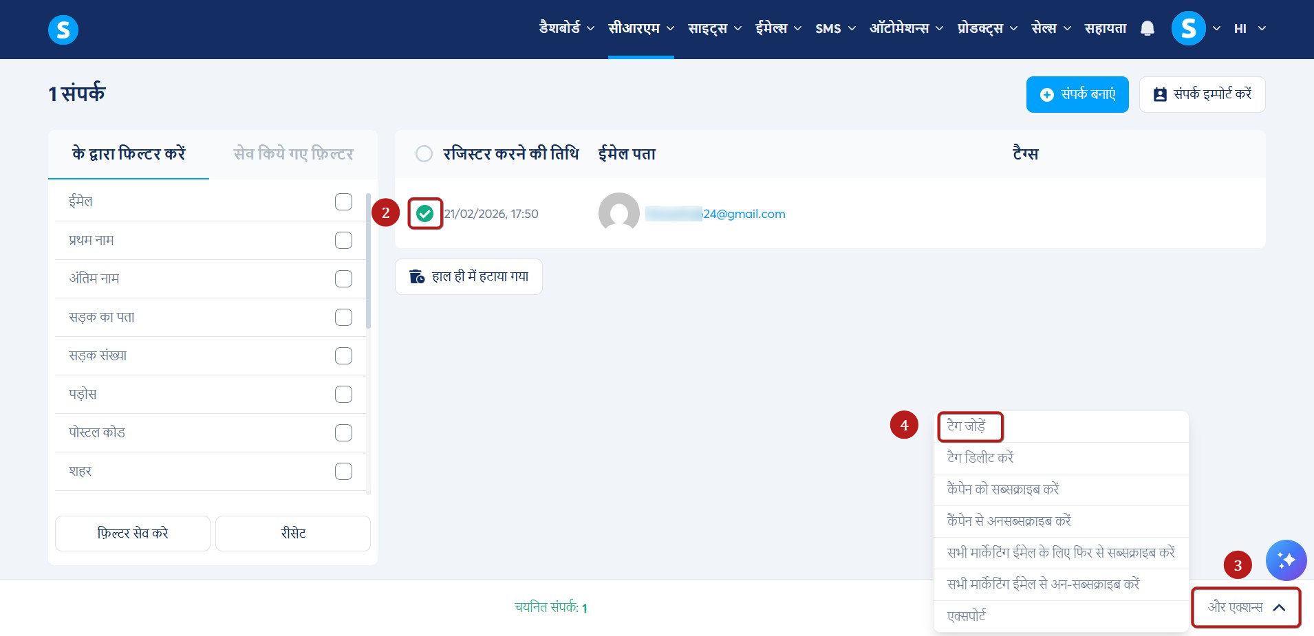 उस संपर्क का चयन करें जिसे आप टैग निर्दिष्ट करना चाहते हैं (2), फिर अधिक कार्रवाइयां (3) पर क्लिक करें और टैग जोड़ें (4) चुनें।