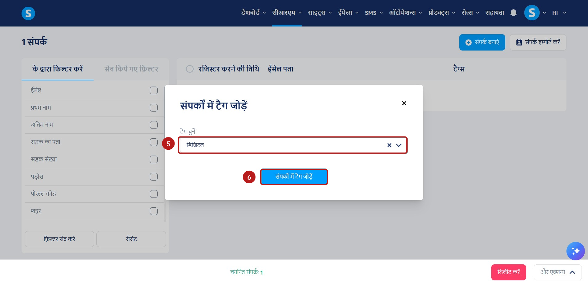 एक पॉपअप दिखाई देगा. वह टैग चुनें जिसे आप अपने संपर्क (5) को निर्दिष्ट करना चाहते हैं, फिर संपर्कों में टैग जोड़ें (6) पर क्लिक करें।