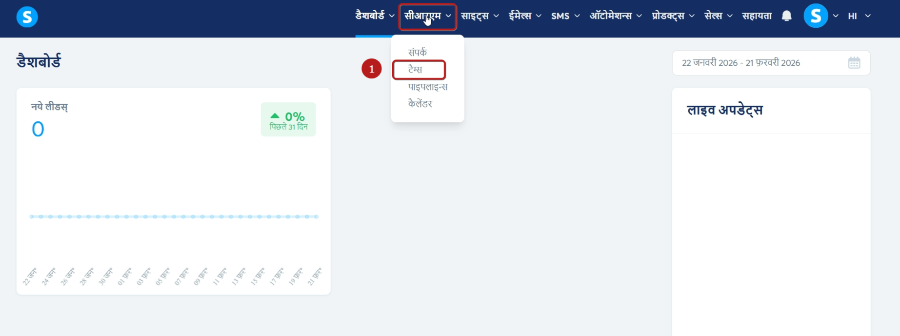 टैग बनाने के लिए, CRM टैब पर जाएँ और टैग (1) पर क्लिक करें.