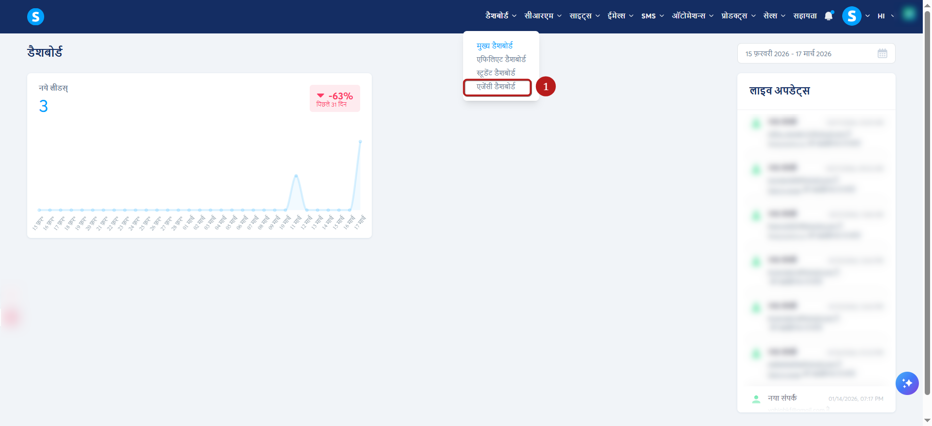 डैशबोर्ड टैब के अंतर्गत एजेंसी डैशबोर्ड (1) पर नेविगेट करें।