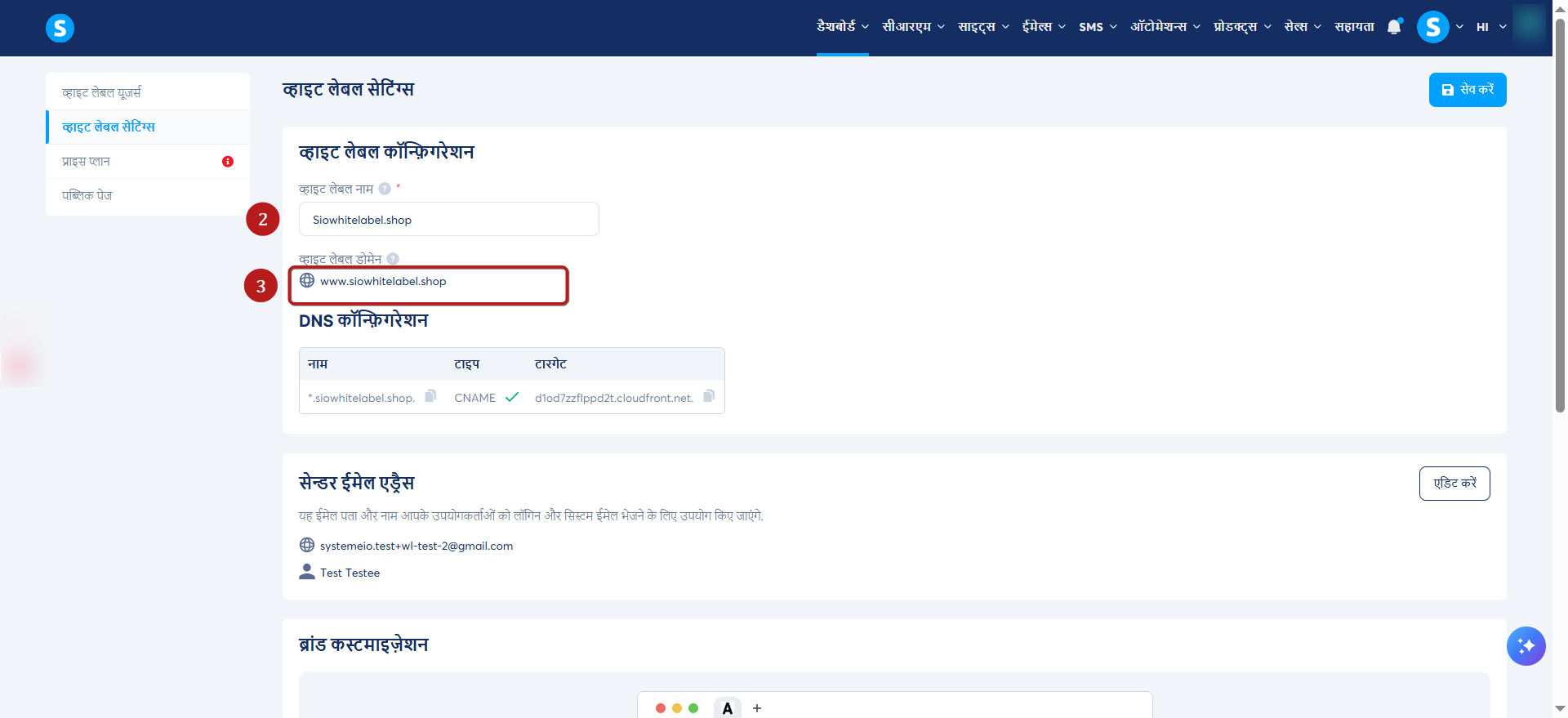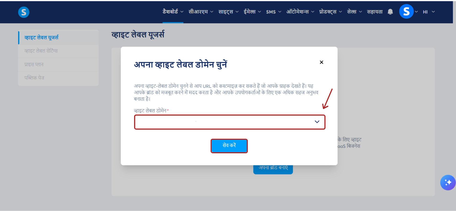 अपना व्हाइट लेबल डोमेन चुनें और सेव पर क्लिक करें।
