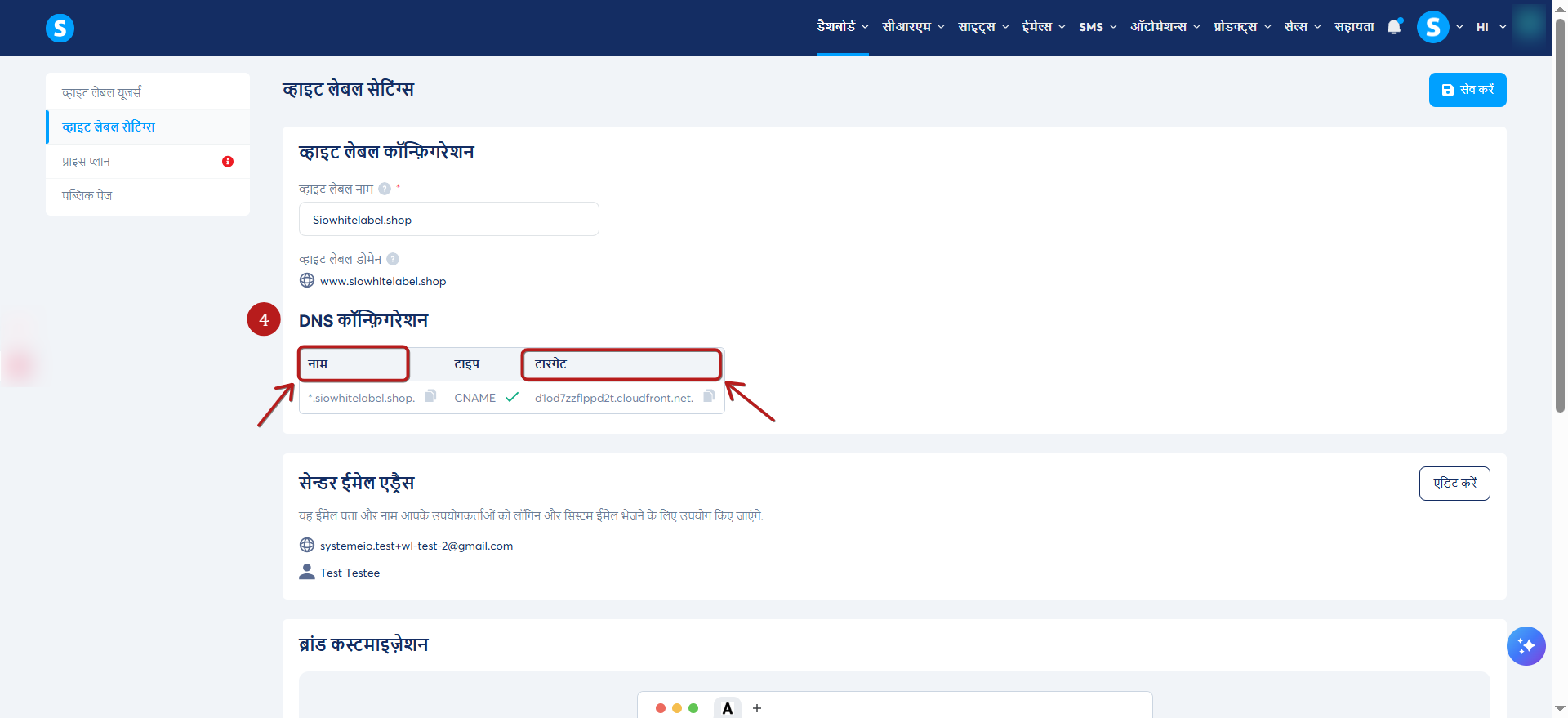 व्हाइट लेबल सक्रिय होने के बाद, आपको व्हाइट लेबल सेटिंग्स पर रीडायरेक्ट किया जाएगा, जहां आपको एक नया CNAME मान दर्ज करना होगा।