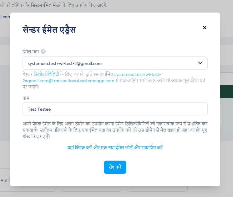 महत्वपूर्ण: आपके द्वारा यहां कॉन्फ़िगर किया गया प्रेषक ईमेल पता और प्रेषक नाम आपके White लेबल डोमेन से आपके White लेबल उपयोगकर्ताओं को भेजे गए सभी ईमेल पर लागू होगा.