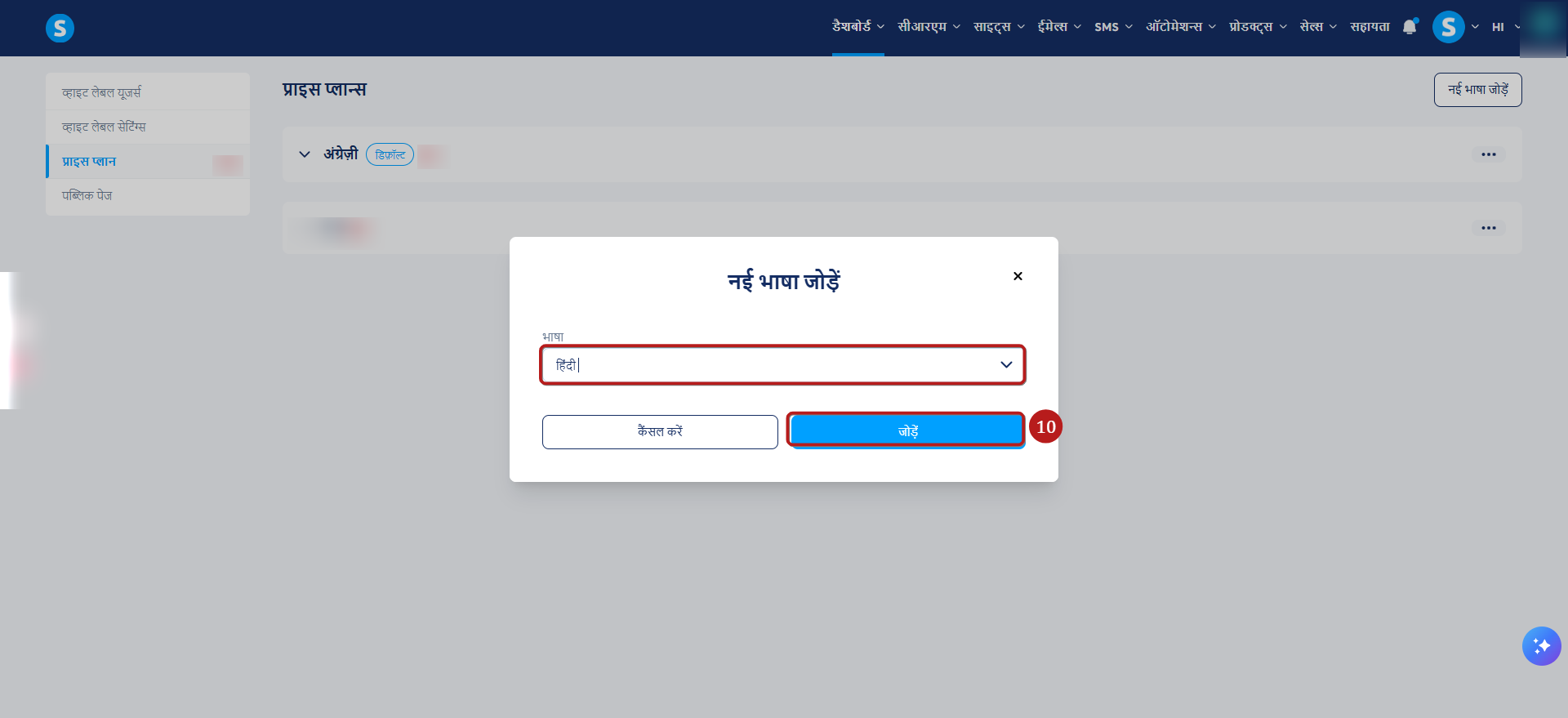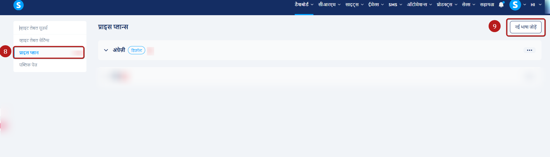 अतिरिक्त भाषाओं के लिए मूल्य योजनाएँ बनाने के लिए, अपने एजेंसी डैशबोर्ड पर प्राइस प्लान (8) पर जाएँ, फिर एक नई भाषा जोड़ें (9) पर क्लिक करें.