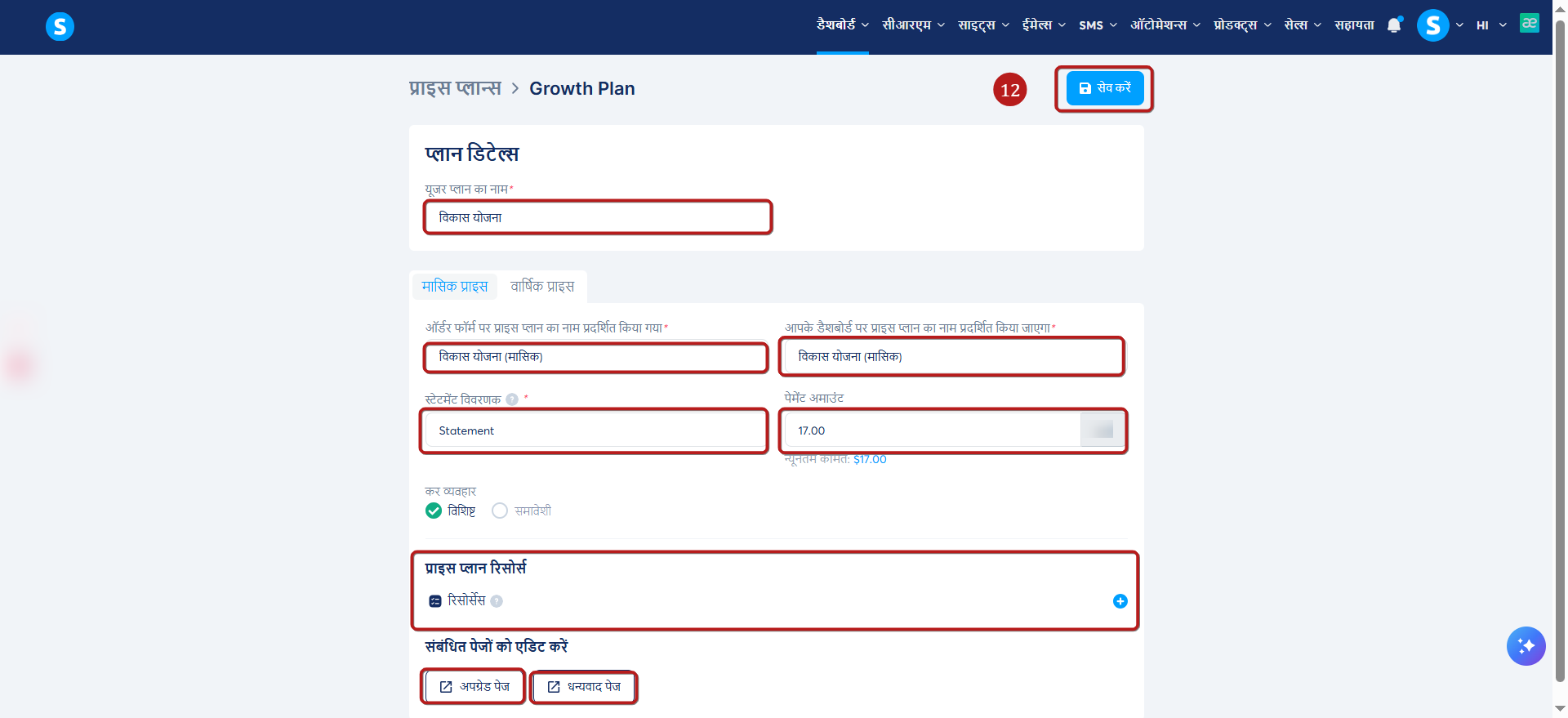 मूल्य योजना संसाधन: इस योजना में अतिरिक्त संसाधन जोड़ने के लिए संसाधन पर क्लिक करें, जैसे टैग या अन्य एसेट जो क्लाइंट द्वारा इस योजना को खरीदने पर स्वचालित रूप से प्रदान किए जाएंगे.