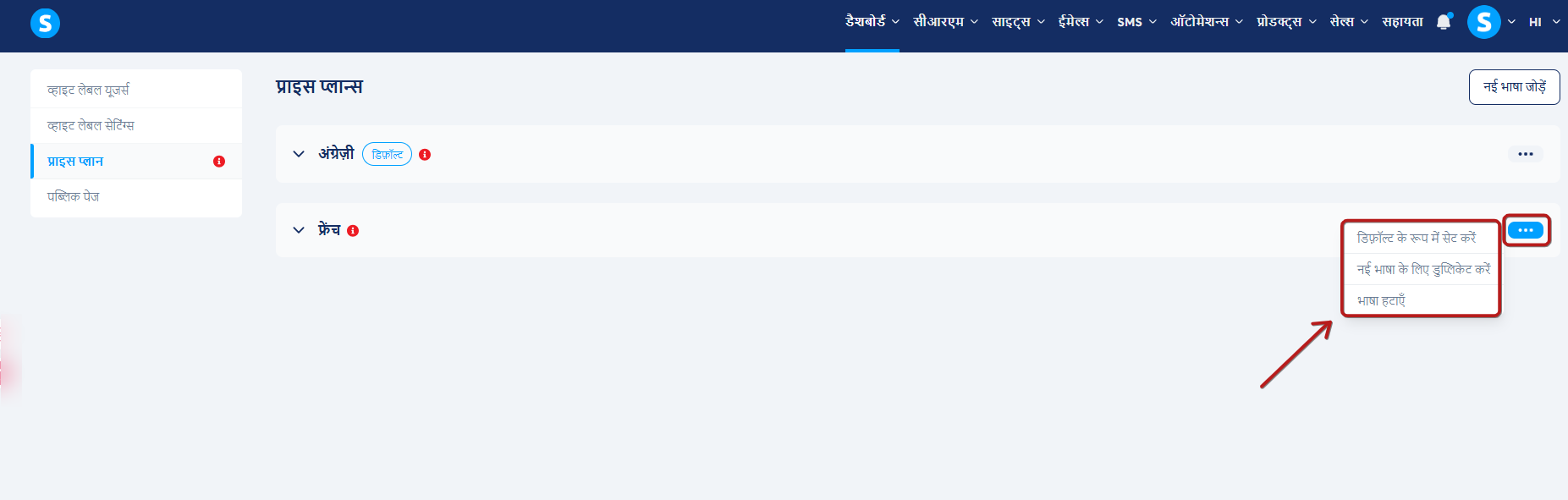 किसी भाषा को सहेजने के बाद, वह आपकी मूल्य योजनाओं की सूची में दिखाई देगी। निम्नलिखित विकल्पों तक पहुंचने के लिए किसी भी भाषा के बगल में तीन-बिंदु मेनू पर क्लिक करें: