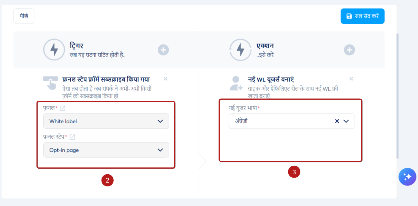 ट्रिगर (2) के रूप में सदस्यता लिए गए फ़नल स्टेप प्रपत्र का चयन करें। इसके बाद, कार्रवाई के रूप में एक नया WL उपयोगकर्ता बनाएं चुनें, उपयोगकर्ता की भाषा (3) चुनें, और नियम को सहेजें।