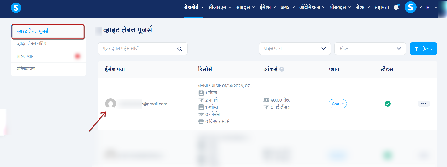 और व्हाइट लेबल उपयोगकर्ता स्वचालित रूप से आपके एजेंसी डैशबोर्ड के व्हाइट लेबल उपयोगकर्ता टैब पर दिखाई देगा।