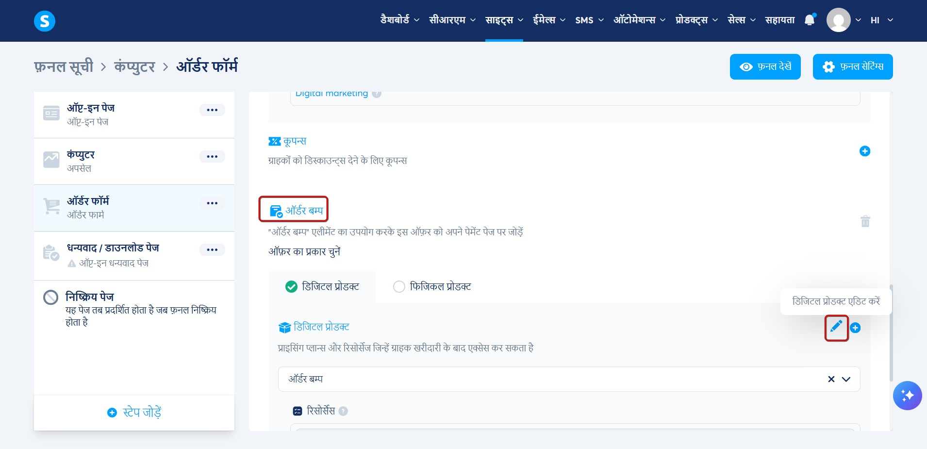- अपने पेमेंट पेज की सेटिंग पर जाएं. ऑर्डर बम्प अनुभाग के अंतर्गत, डिजिटल प्रोडक्ट एडिट करने के लिए पेंसिल आइकन पर क्लिक करें.