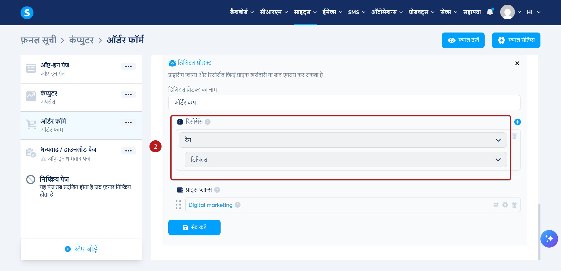 रिसोर्स सेक्शन में, आपके द्वारा अभी बनाया गया ऑर्डर बम्प टैग जोड़ें (2)।