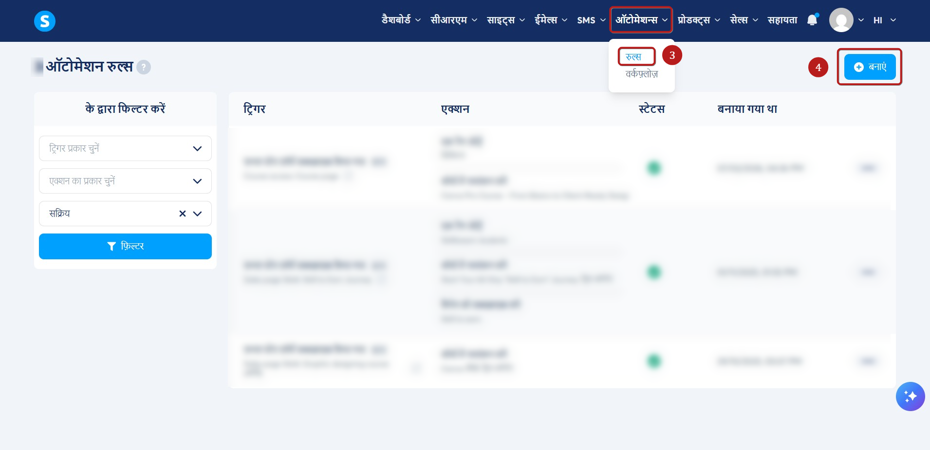 - मुख्य मेनू में ऑटोमेशन > नियम (3) पर जाएँ। बनाएं (4) पर क्लिक करें।