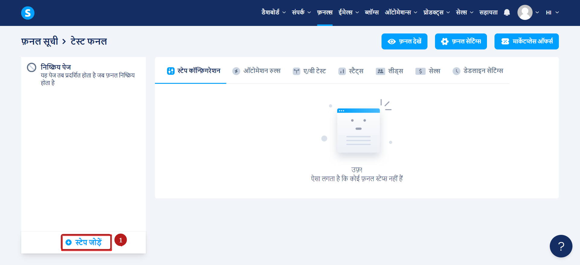 अपने फ़नल पर जाएं जिसमें आप एक धन्यवाद पेज जोड़ना चाहते हैं, फिर अपने फ़नल पेज के मेनू के बाईं ओर "स्टेप जोडें " पर क्लिक करें (छवि में नंबर 1)।
