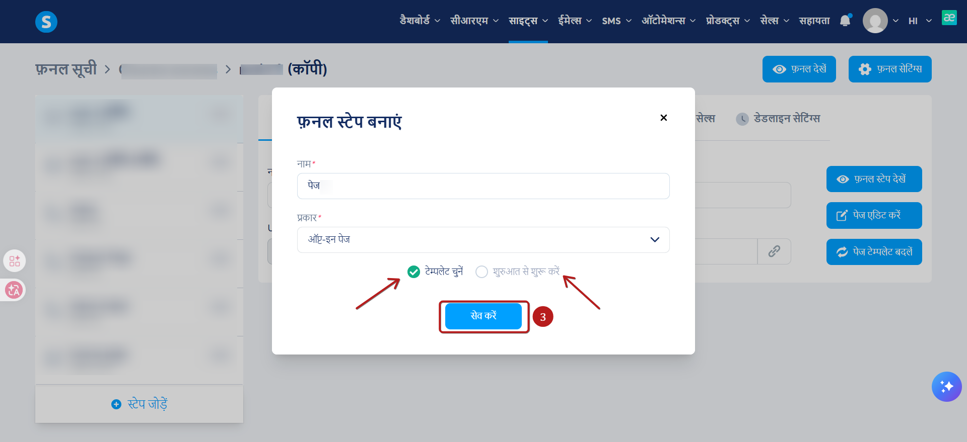 आप एक टेम्पलेट चुन सकते हैं या अपना पेज खरोंच से बना सकते हैं; फिर, अपना पेज बनाने के लिए "सेव" पर क्लिक करें। (चित्र में नंबर 4)