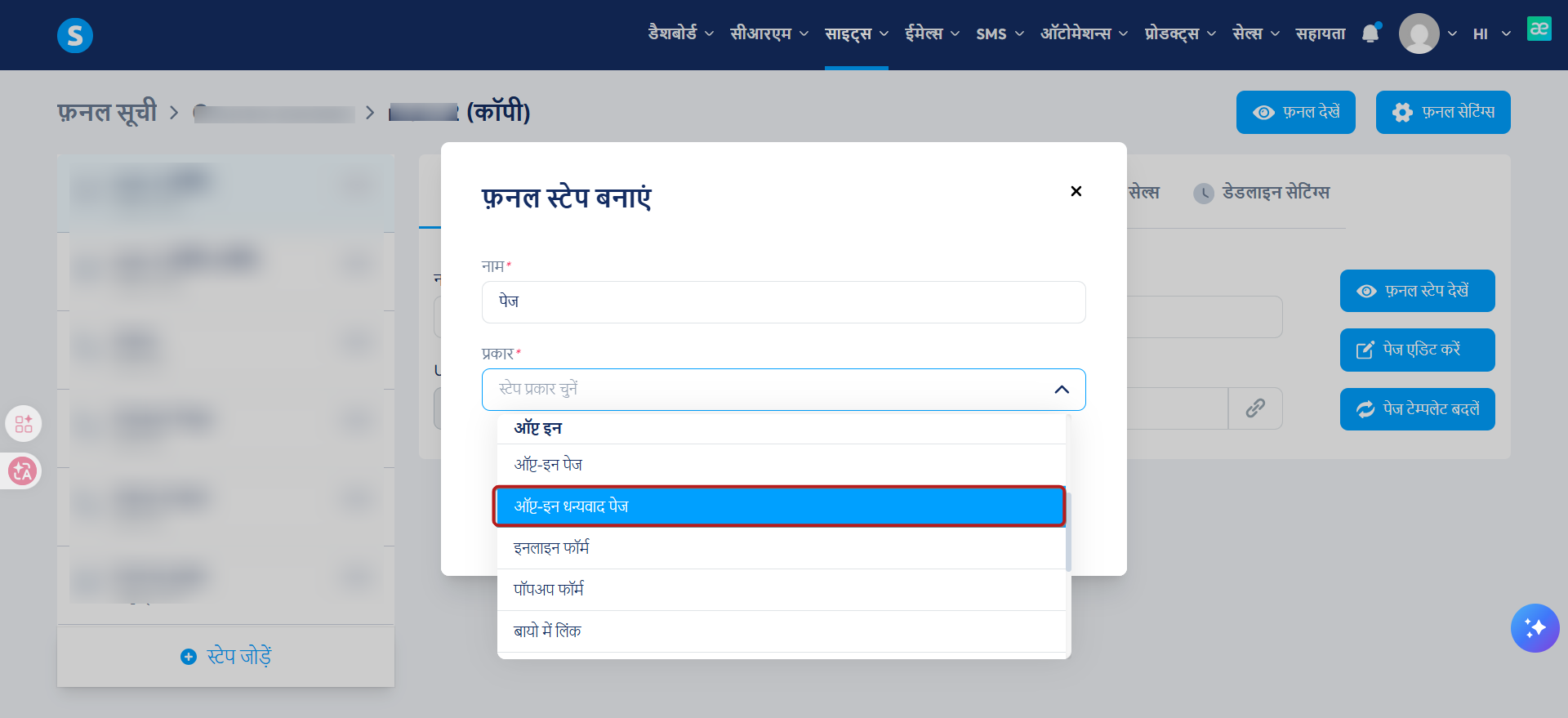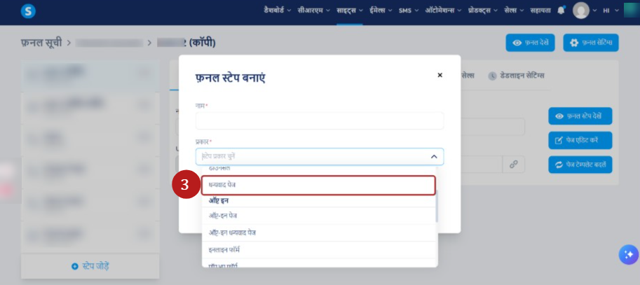 "प्रकार" फ़ील्ड से, "धन्यवाद पेज" प्रकार का चयन करें (छवि में नंबर 2)।