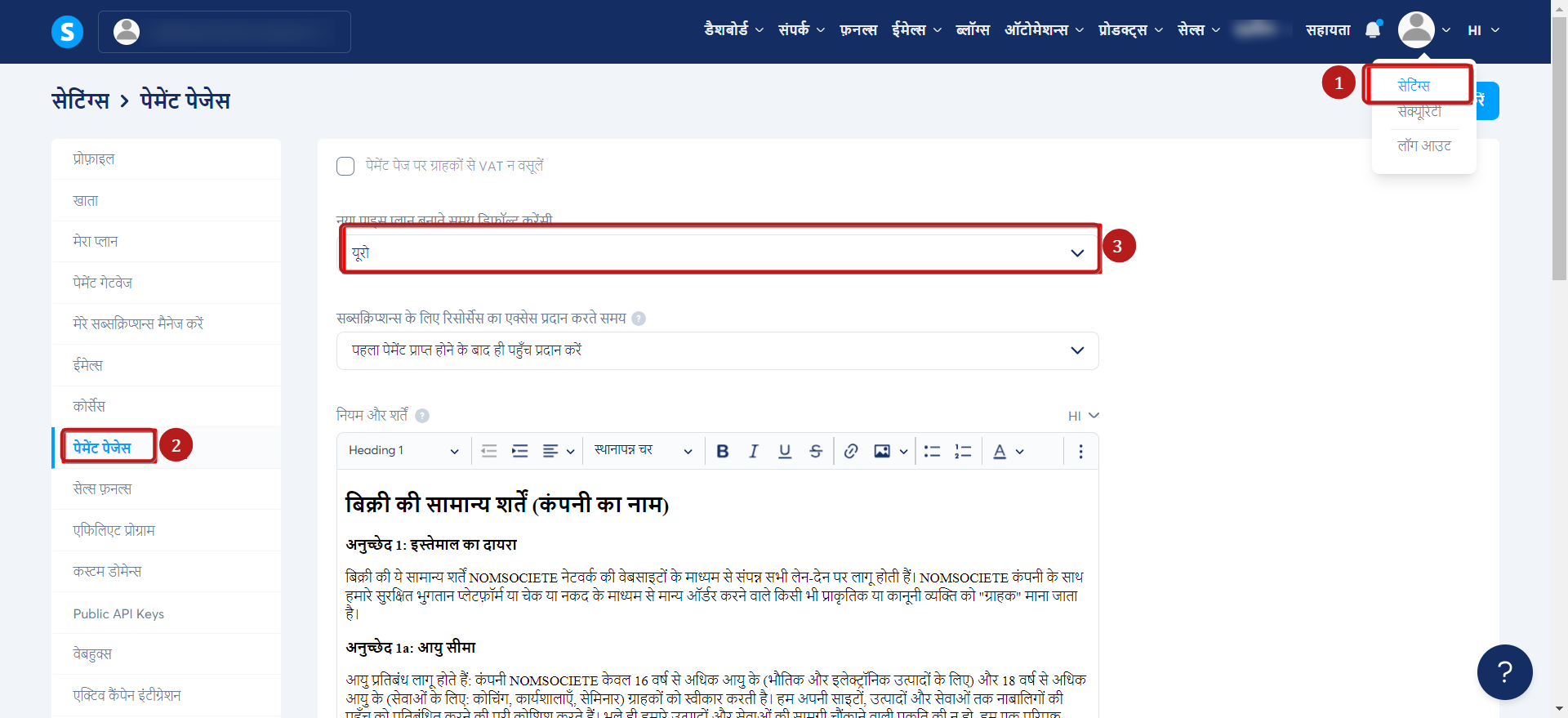 अपने प्रोफ़ाइल चित्र पर जाएं, सेटिंग्स (1) पर क्लिक करें, फिर भुगतान सेटिंग्स (2) पर क्लिक करें। आवश्यकतानुसार नई मूल्य योजना बनाते समय डिफ़ॉल्ट मुद्रा बदलें (3)।