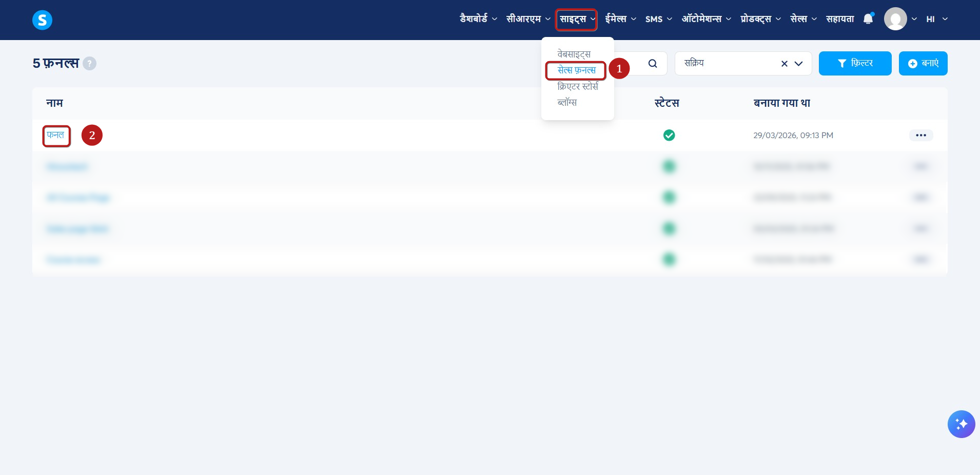 Sales फ़नल (1) पर नेविगेट करें और उस फ़नल का चयन करें जिसमें वह पृष्ठ है जिसे आप ले जाना चाहते हैं (2).