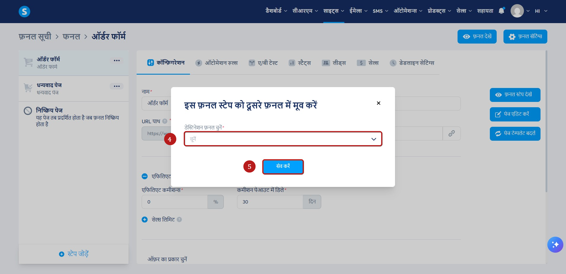 गंतव्य फ़नल (4) चुनें, फिर सहेजें (5) पर क्लिक करें।