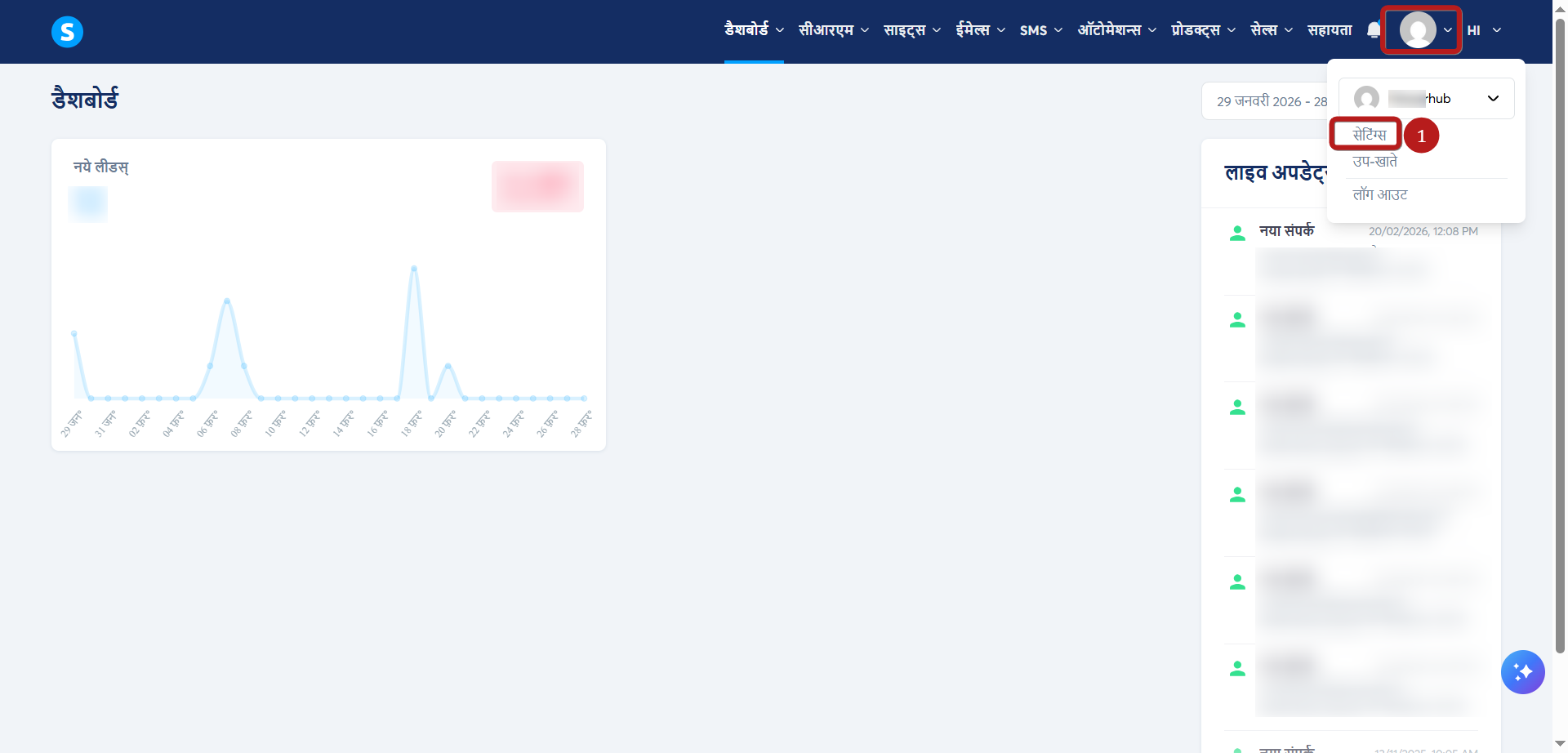 - अपने खाते में लॉग इन करें, अपने प्रोफ़ाइल पिक्चर पर क्लिक करें, फिर सेटिंग्स (1) पर क्लिक करें।