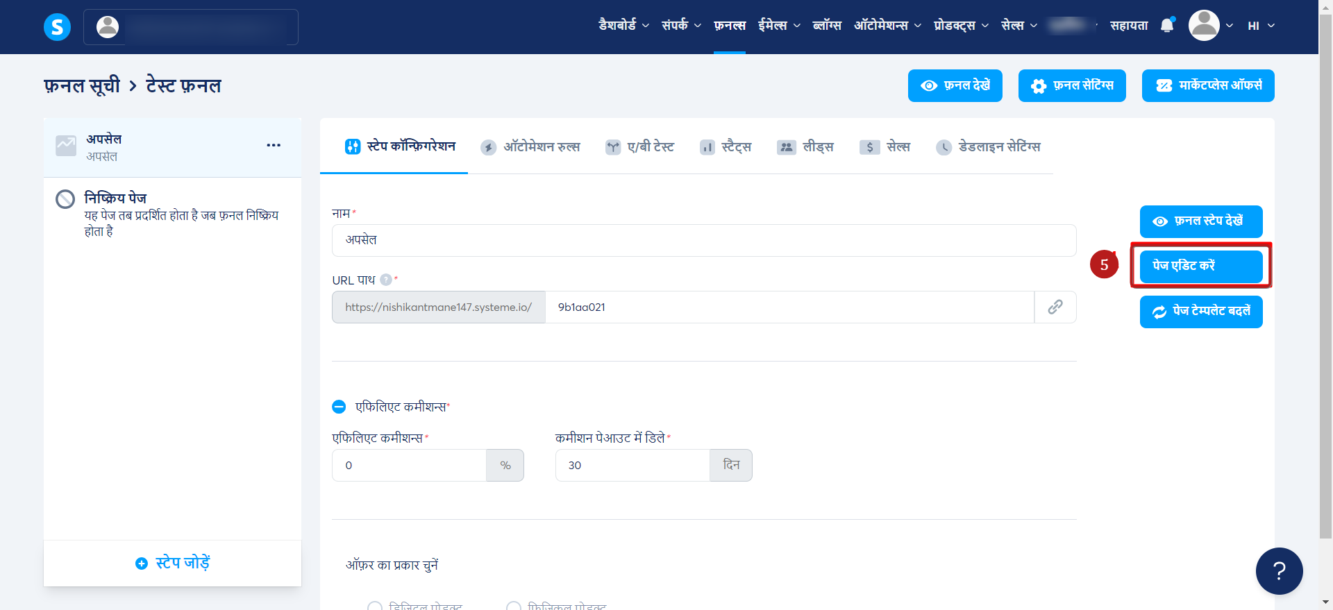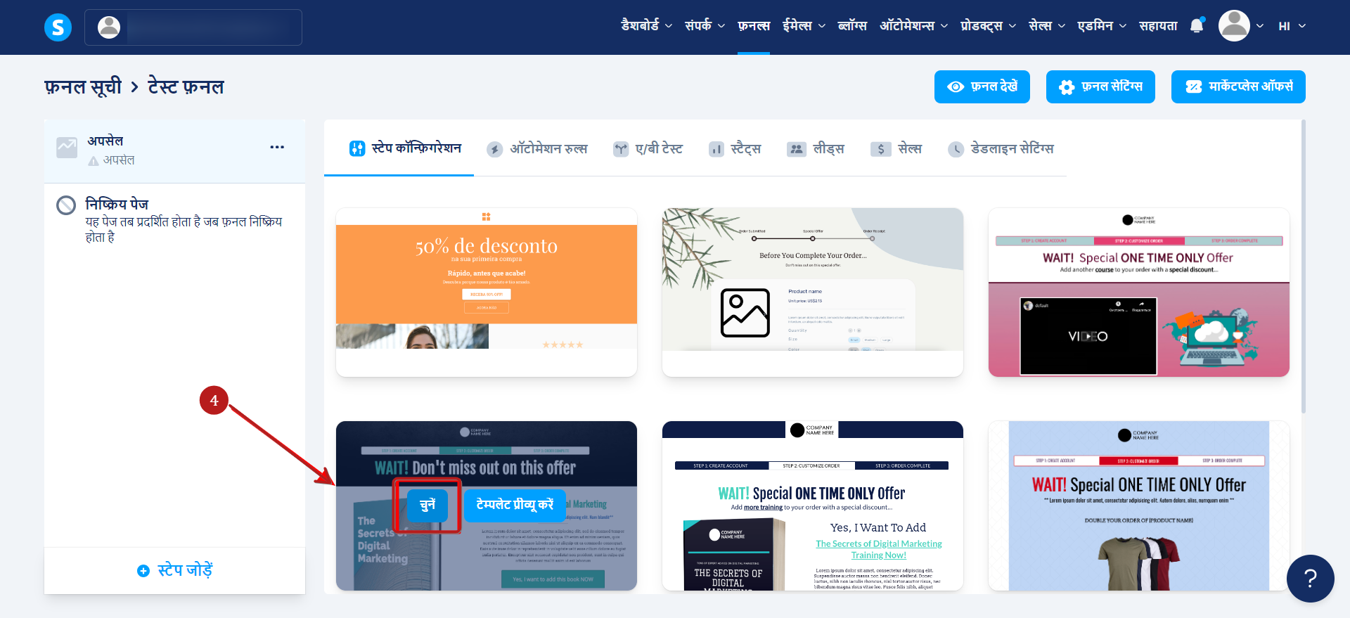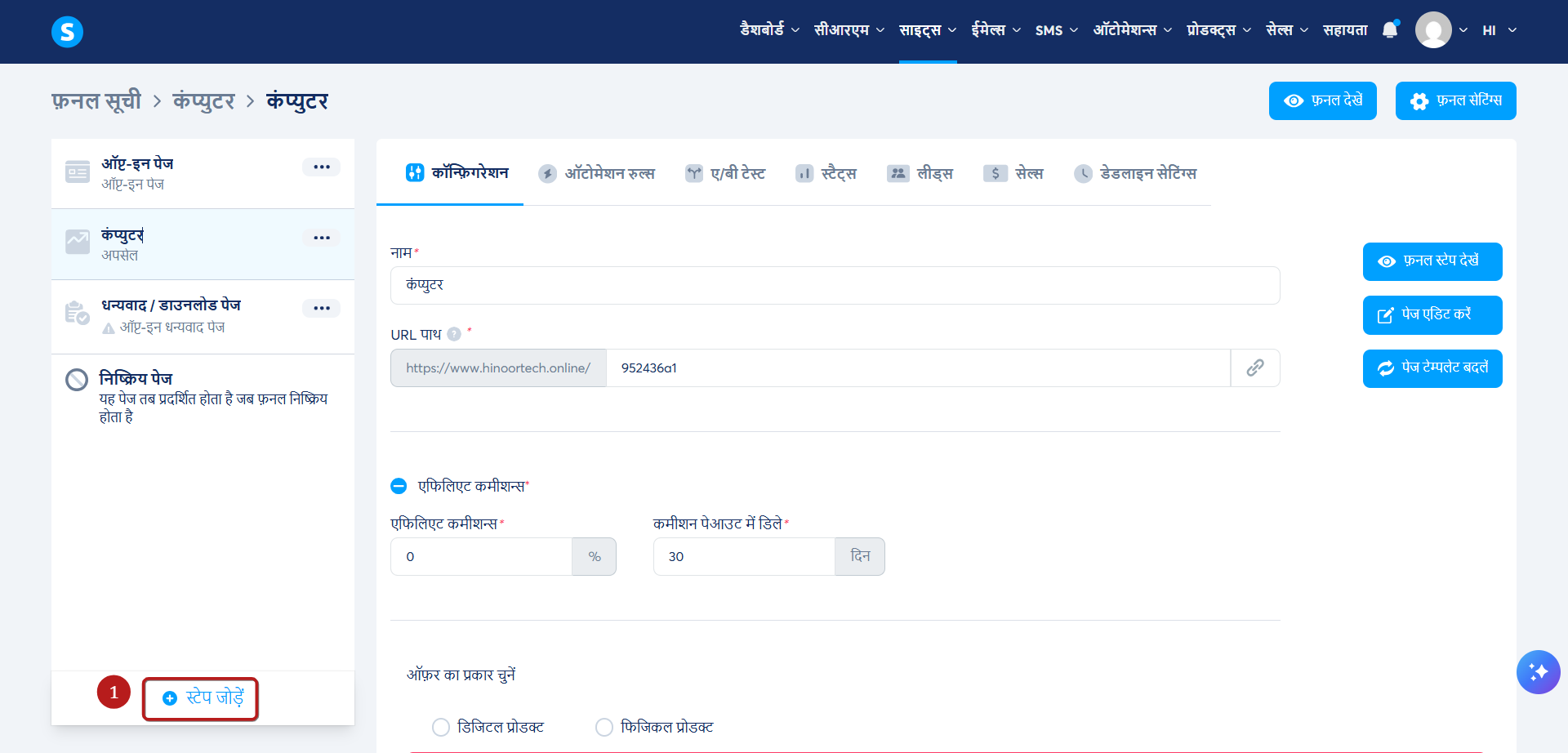 उस विक्रय फ़नल पर जाएँ जहाँ आप पृष्ठ जोड़ना चाहते हैं. बाईं ओर दिए गए मेनू में, चरण जोड़ें (1) पर क्लिक करें.