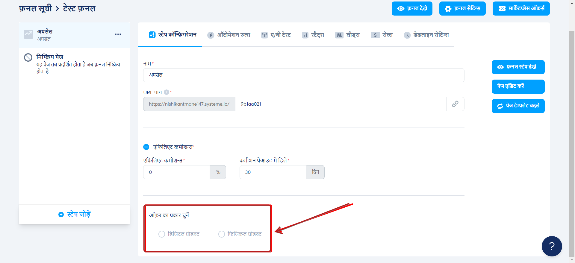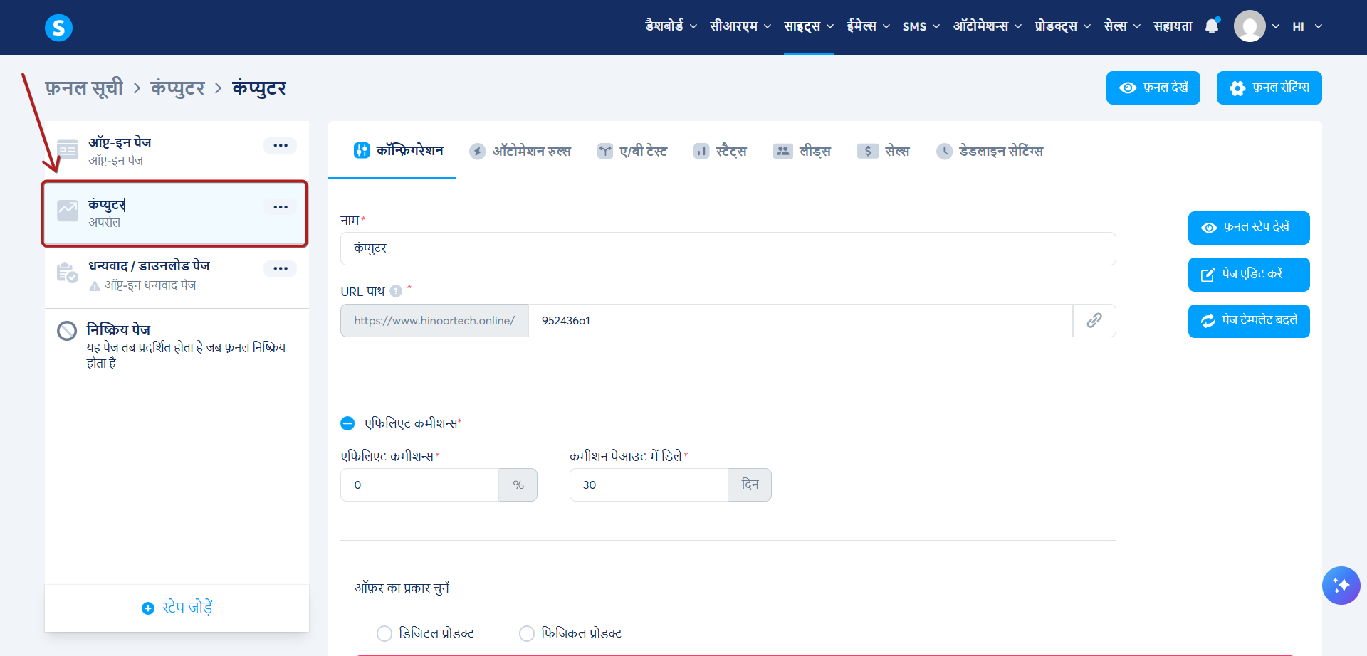 नोट: अपसेल पेज को मुख्य ऑर्डर फॉर्म के बाद रखा जाना चाहिए, और डाउनसेल पेज को अपसेल पेज के बाद रखा जाना चाहिए।