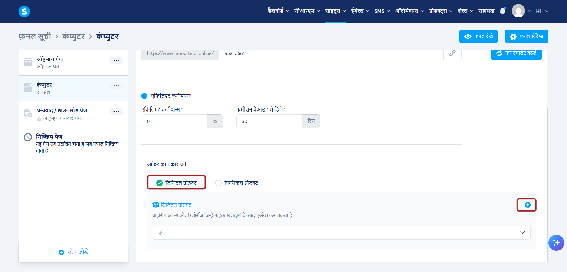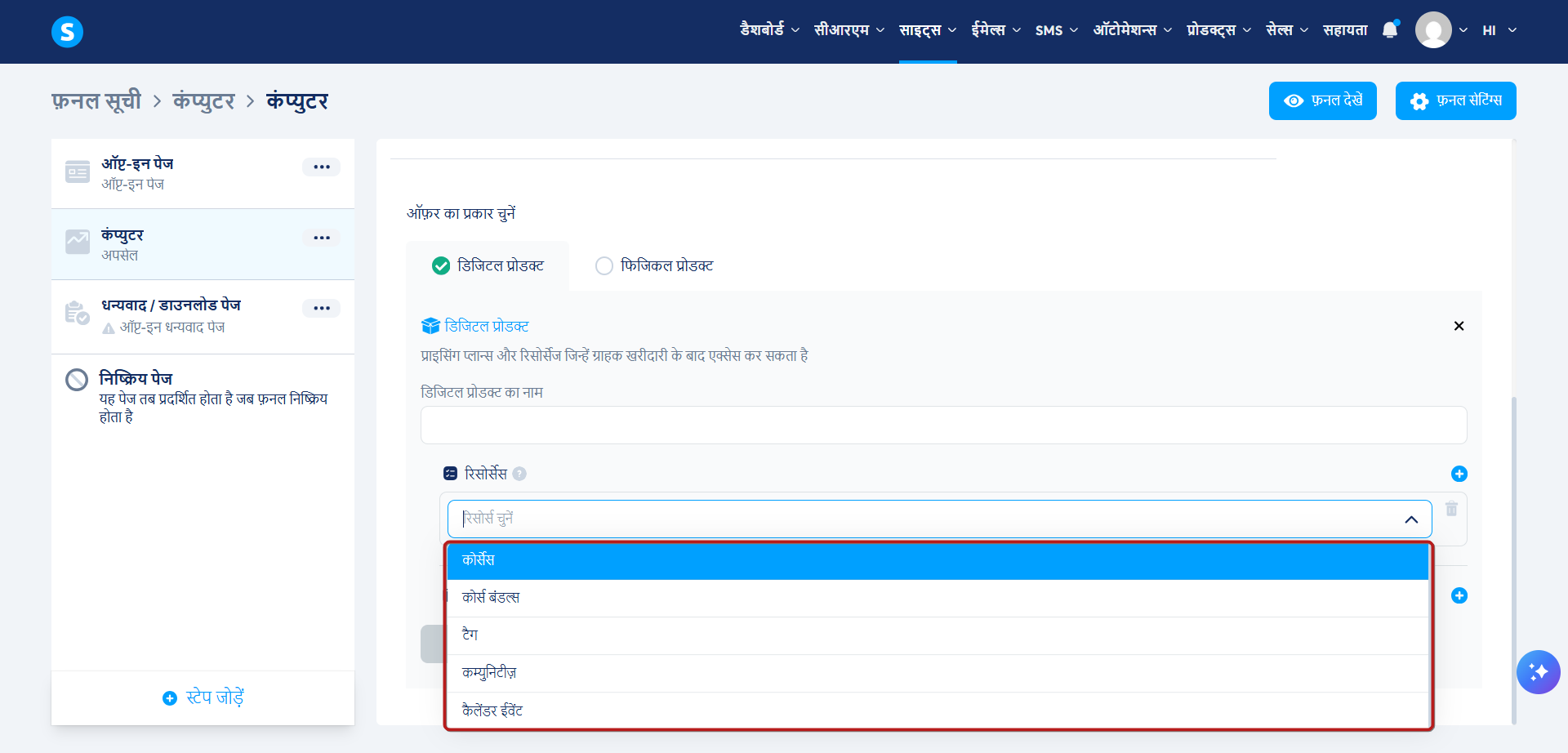 अपने विक्रय फ़नल में, अपसेल/डाउनसेल पृष्ठ का चयन करें। फिर, ऑफ़र प्रकारों में से डिजिटल उत्पाद चुनें।
