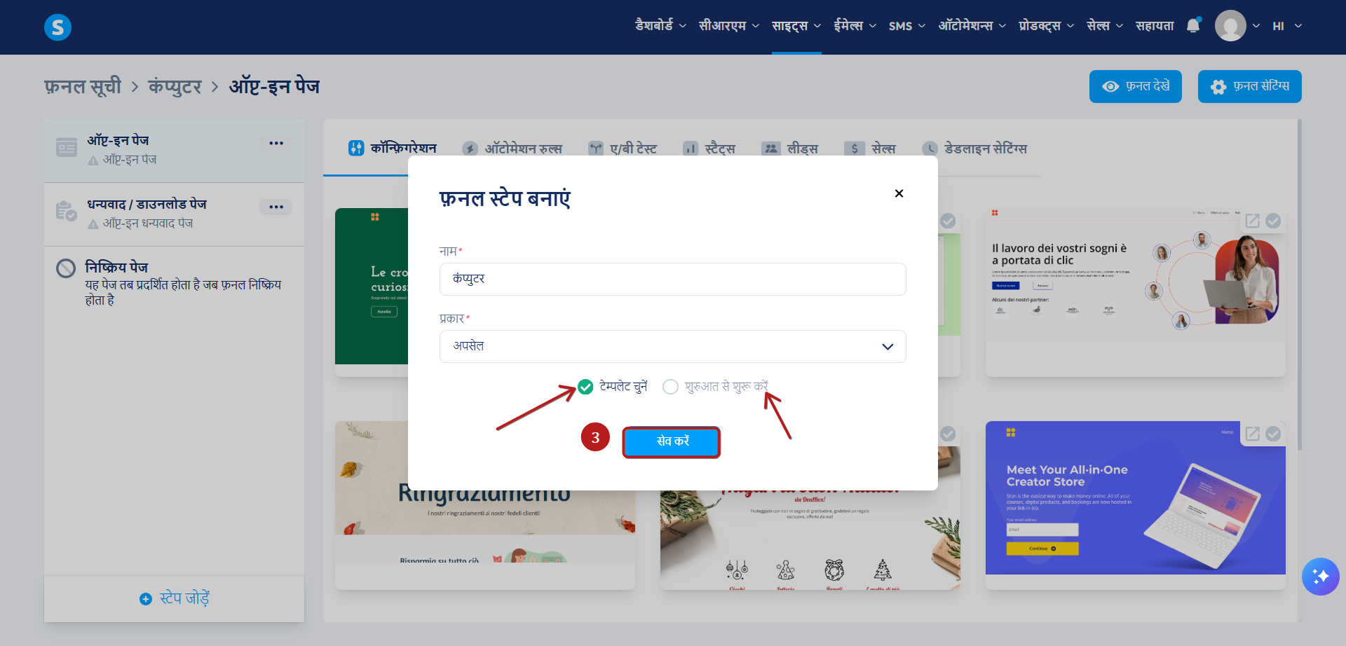 एक टेम्प्लेट चुनें या स्क्रैच से अपना पेज बनाएं, फिर सहेजें (3) पर क्लिक करें।