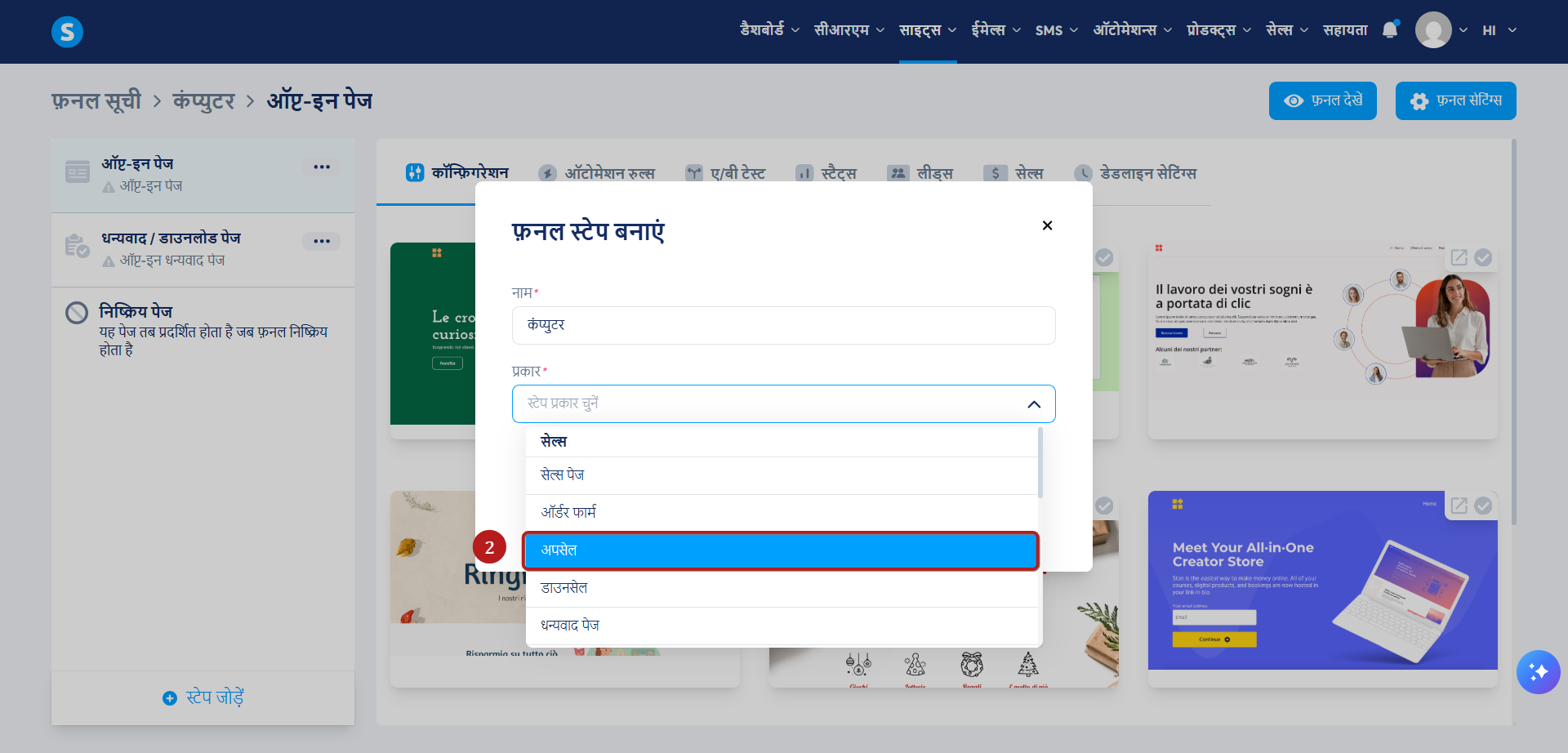 फ़नल बनाएं चरण पॉपअप में, प्रकार (2) के रूप में अपसेल या डाउनसेल चुनें।