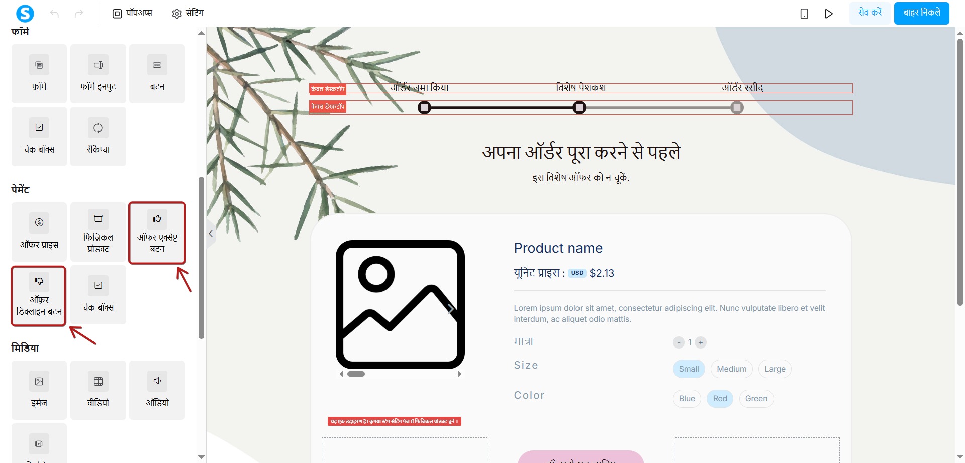ध्यान दें: ''पेज संपादक के अंदर, आपको 'स्वीकार करें' और 'अस्वीकार करें' बटन जोड़ना होगा ताकि ग्राहक ऑफ़र लेने या अस्वीकार करने का विकल्प चुन सके।