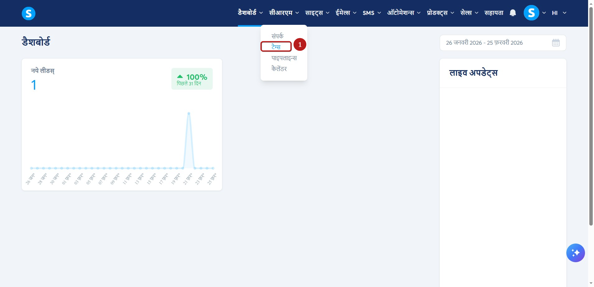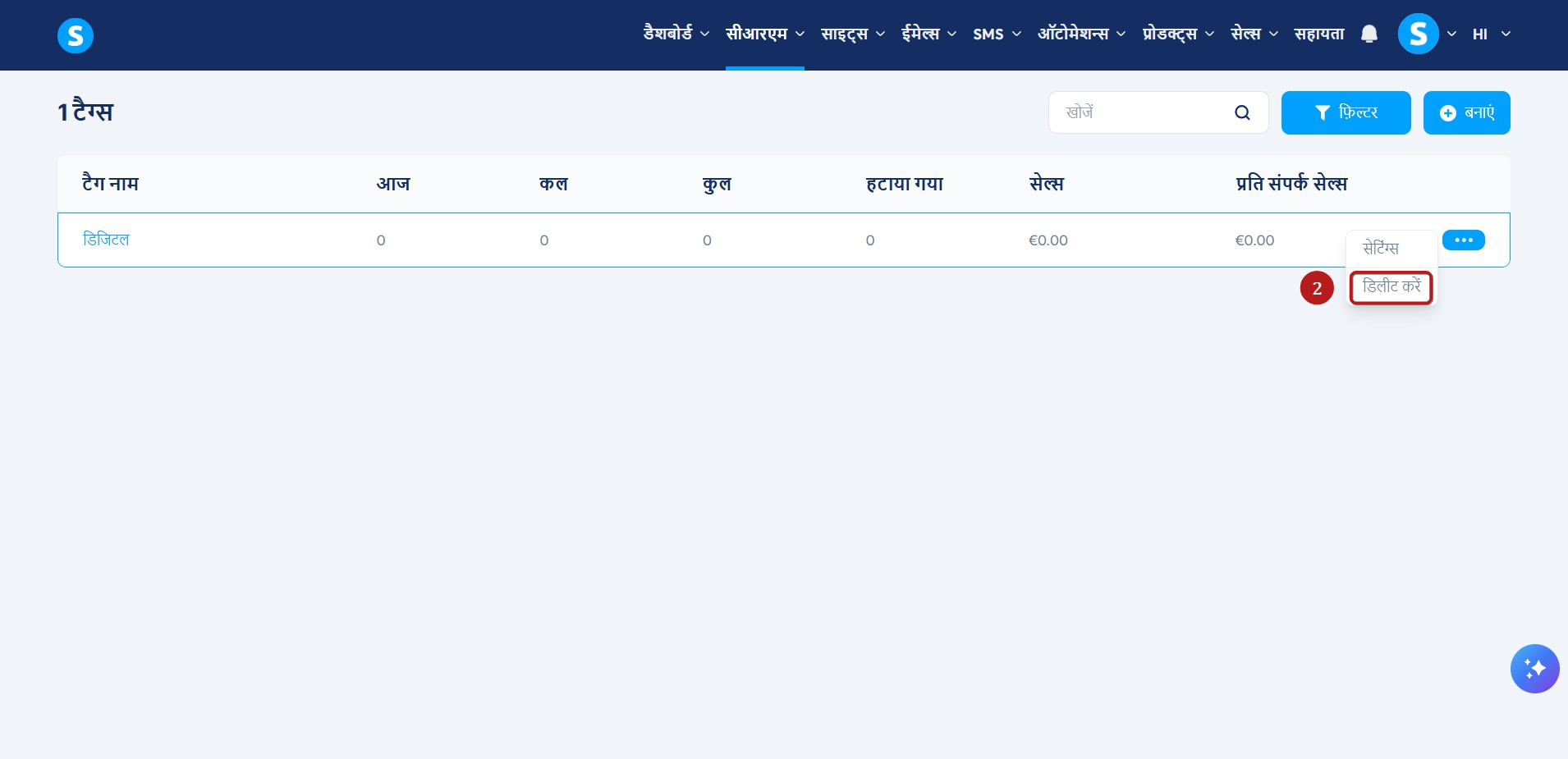 कभी-कभी उस टैग को हटाना उपयोगी हो सकता है जिसका आप अब उपयोग नहीं करते हैं। किसी टैग को हटाने के लिए, CRM टैब पर नेविगेट करें और टैग (1) चुनें.