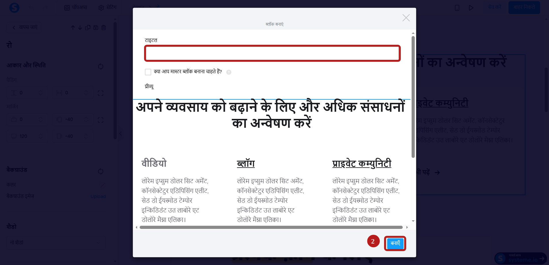 ब्लॉक का नाम इस तरह रखें कि आप इसे आसानी से ढूंढ सकें, और "क्रीऐट करे " पर क्लिक करें ( 2)।