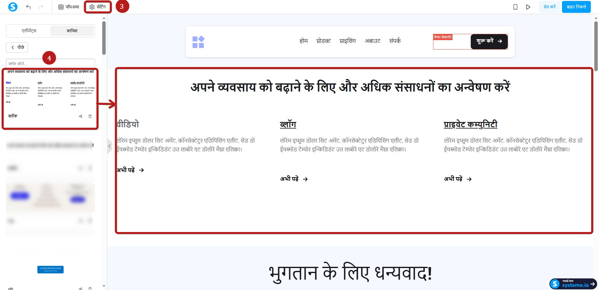 किसी सेव किए गए ब्लॉक को पेज पर इन्सर्ट करने के लिए, पेज के एडिटर पर जाएँ, "ब्लॉक " (इमेज में नंबर 3) पर क्लिक करें, फिर ब्लॉक को पेज पर ड्रैग और ड्रॉप करें (इमेज में नंबर 4)।