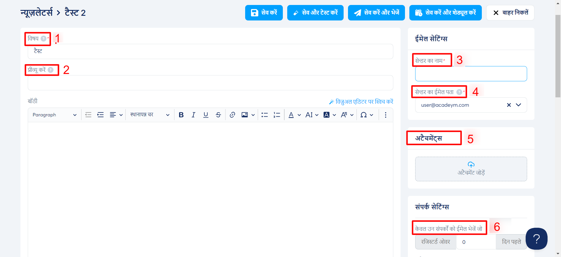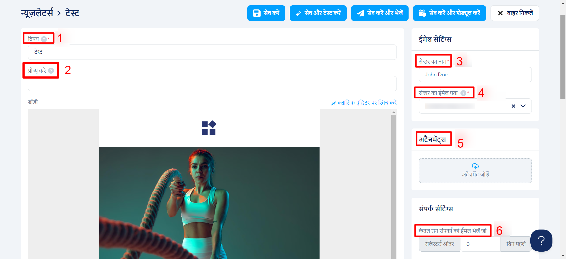 - सेव और टेस्ट करें - अपने न्यूज़लेटर को सेव करें और एक टेस्ट ईमेल प्राप्त करें