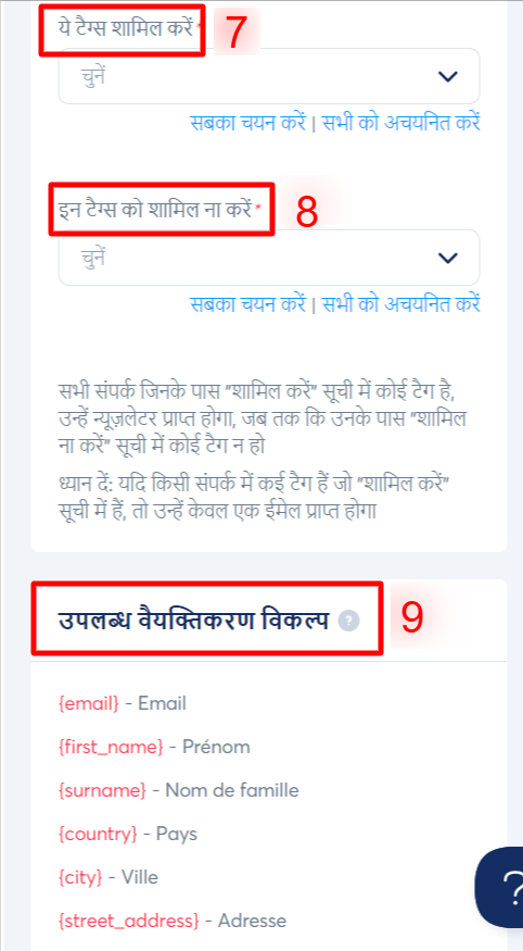 9.न्यूज़लेटर में जोड़ने के लिए उपलब्ध वैरिएबल्स चुनें।