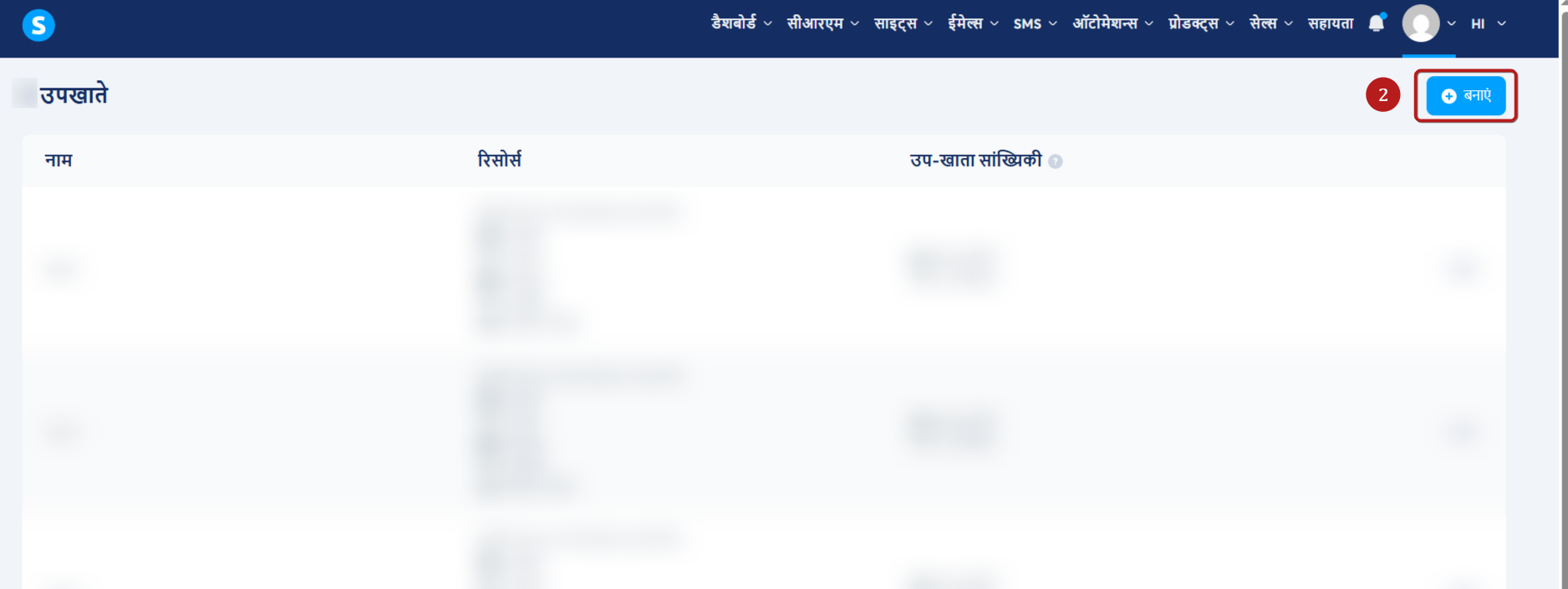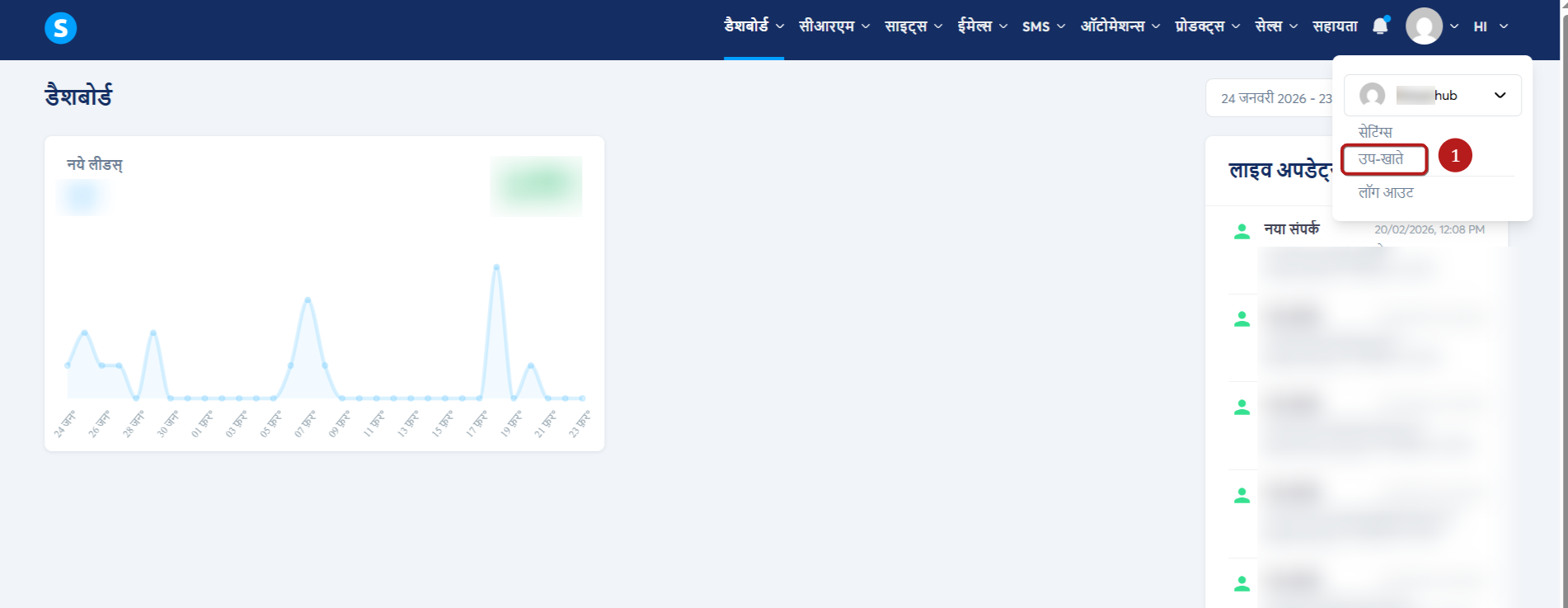 1. डैशबोर्ड से, ऊपरी दाएं कोने में अपने प्रोफ़ाइल चित्र पर क्लिक करें (छवि में नंबर 1), फिर "सब-खाते" चुनें। (चित्र में नंबर 2)