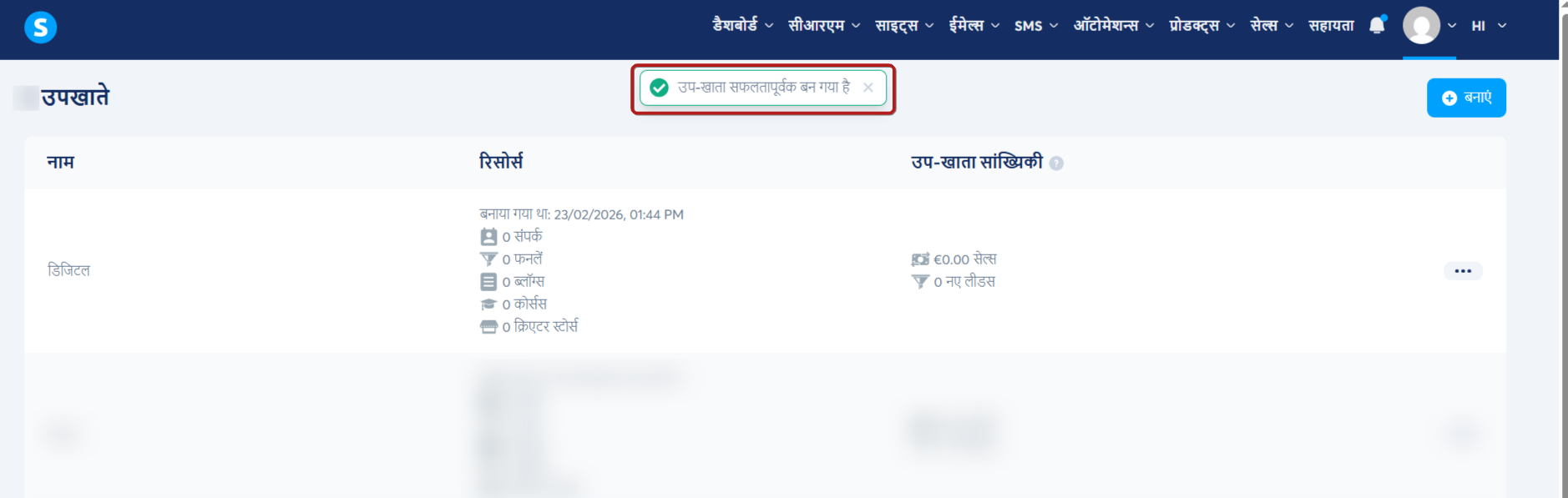 4. उप-खाते के निर्माण को सहेजने के बाद, "उप-खाता सफलतापूर्वक बनाया गया है" बताते हुए एक संदेश स्क्रीन के शीर्ष पर दिखाई देगा, जो उप-खाते के निर्माण की पुष्टि करेगा।