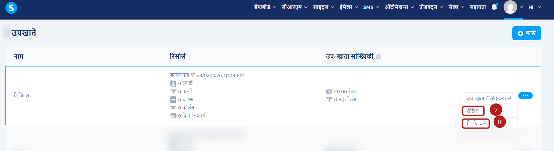 - आप "सेटिंग" अनुभाग (छवि में नंबर 8) पर क्लिक करके उप-खाते का नाम बदल सकते हैं, या "हटाएं" पर क्लिक करके अपना उप-खाता हटा सकते हैं। (छवि में नंबर 9)