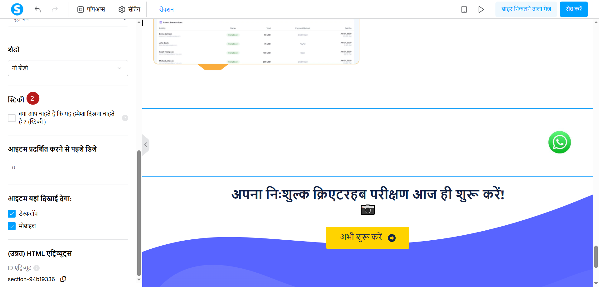 नीचे दिए गए उदाहरण में पृष्ठ के निचले भाग में व्हाट्सएप बटन के साथ कार्रवाई में स्टिकी फीचर दिखाया गया है:
