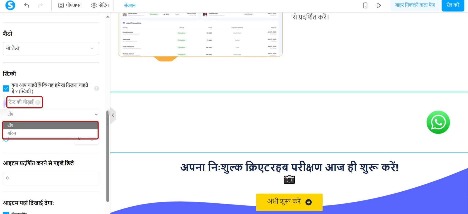 - सामग्री की स्थिति: चुनें कि अनुभाग स्क्रीन के ऊपर या नीचे रहना चाहिए या नहीं।