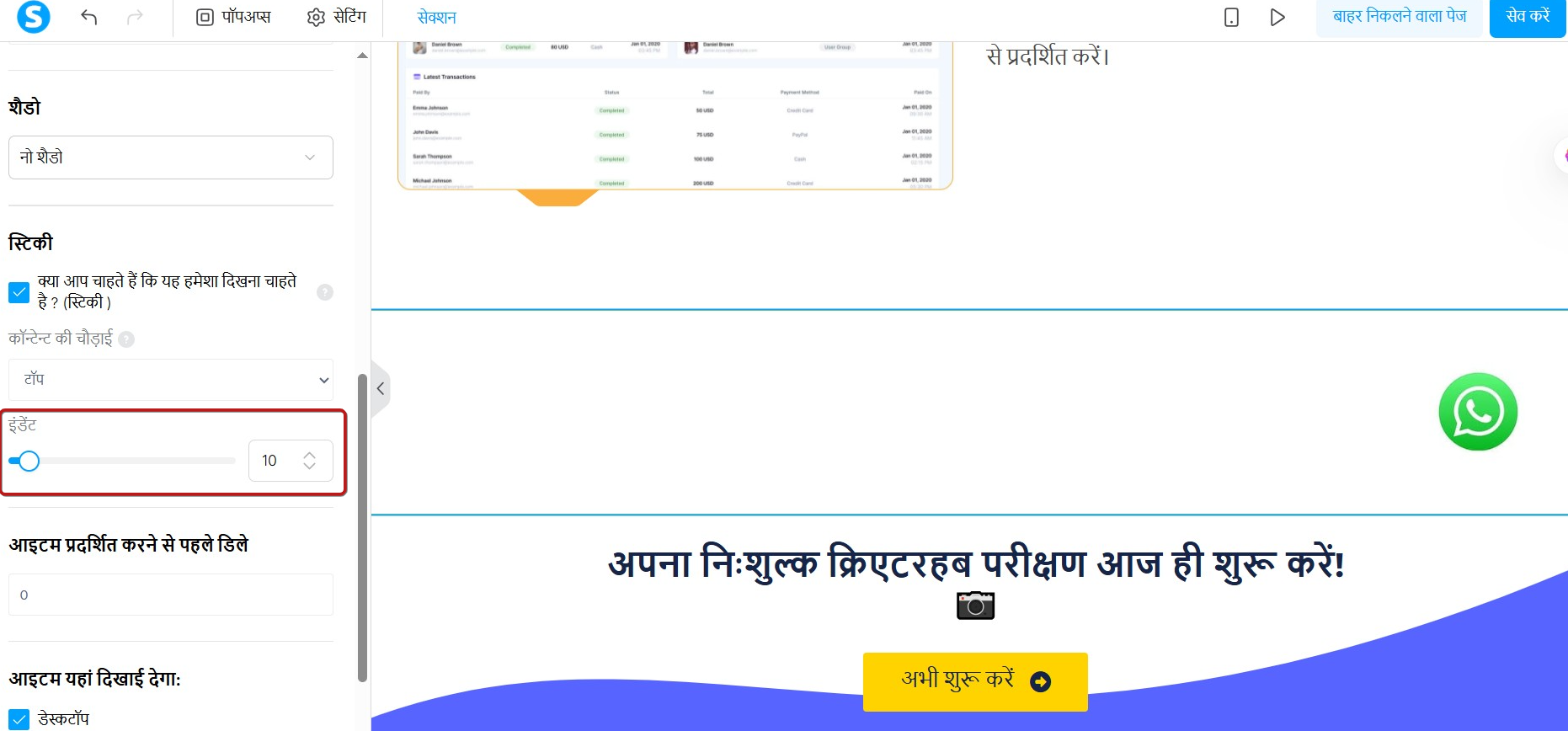 - इंडेंट: स्टिकी सेक्शन और स्क्रीन के किनारे के बीच रिक्ति जोड़ने के लिए स्लाइडर या संख्या फ़ील्ड का उपयोग करें।