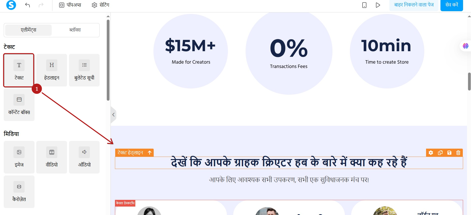 टेक्स्ट एलीमेंट को खींचें और इसे अपने पेज (1) पर छोड़ दें।