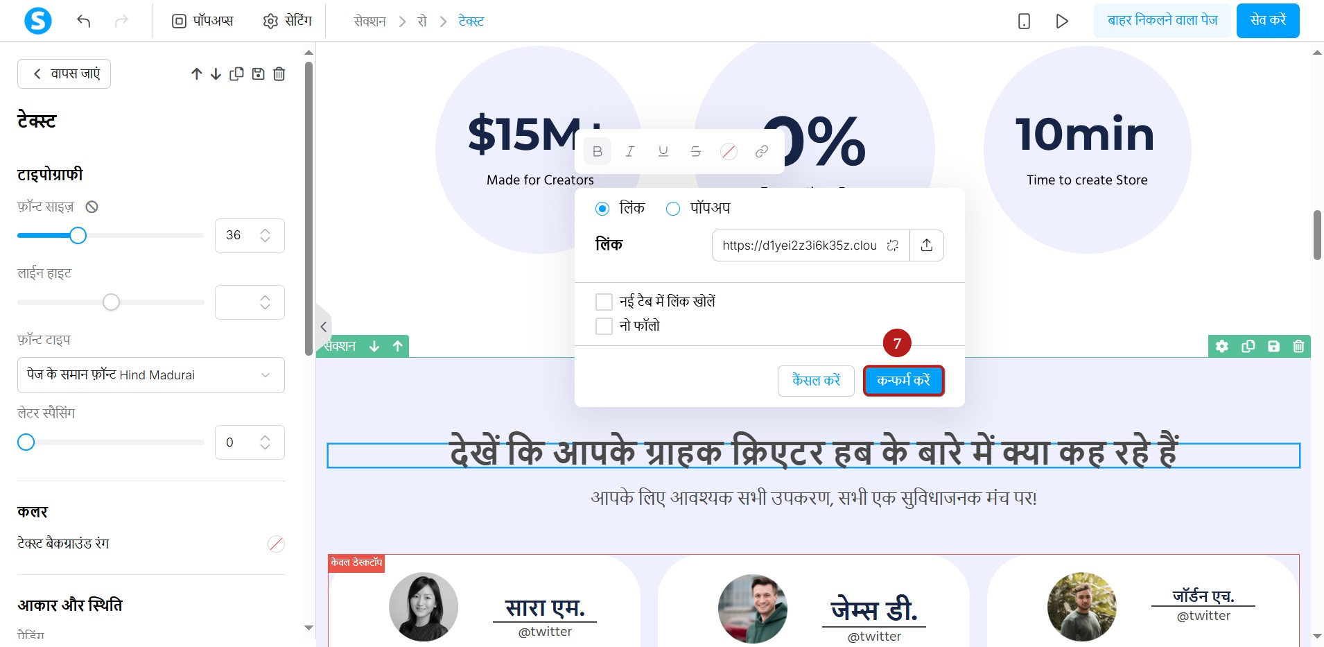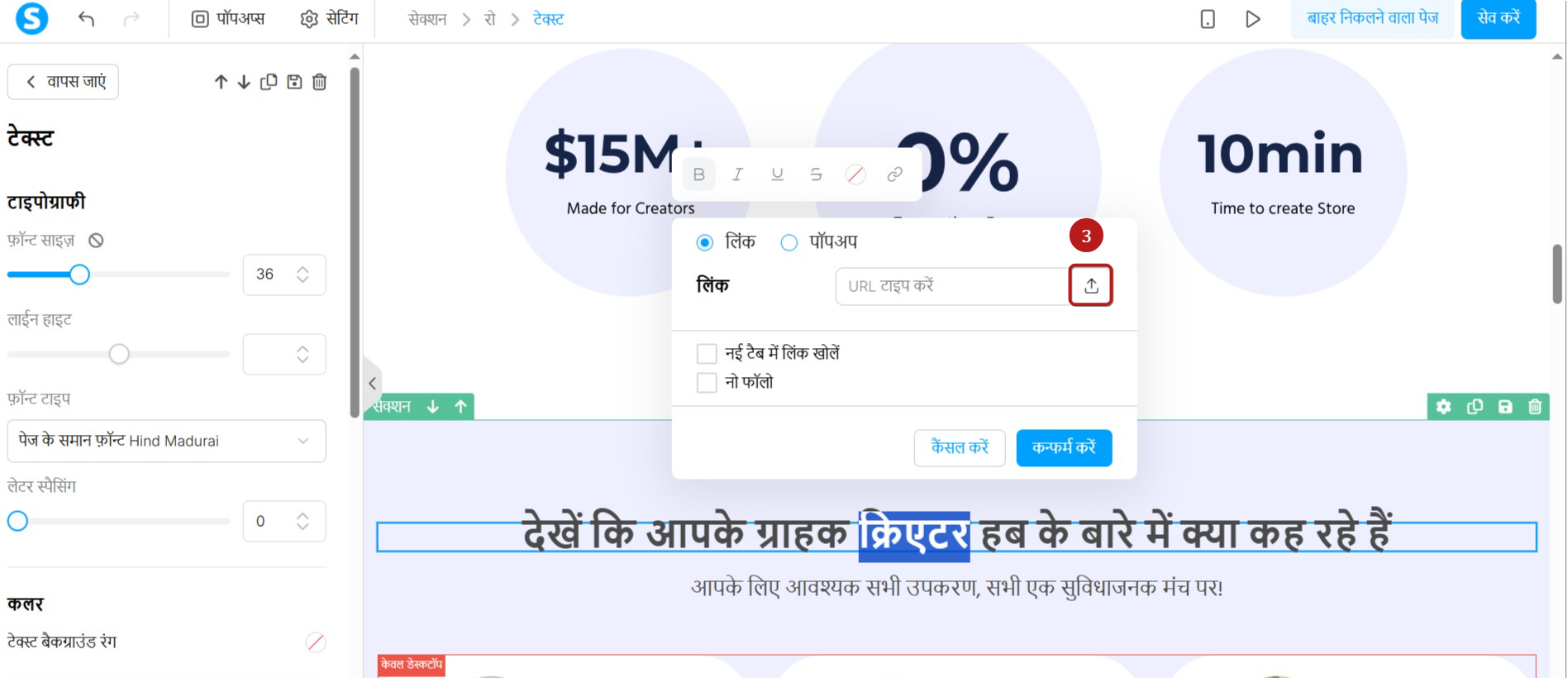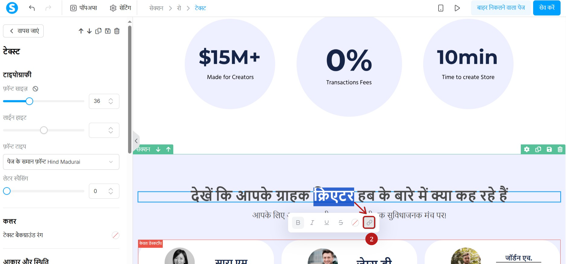 उस टेक्स्ट का चयन करें जिसे आप क्लिक करने योग्य बनाना चाहते हैं और स्ट्रिंग आइकन (2) पर क्लिक करें।