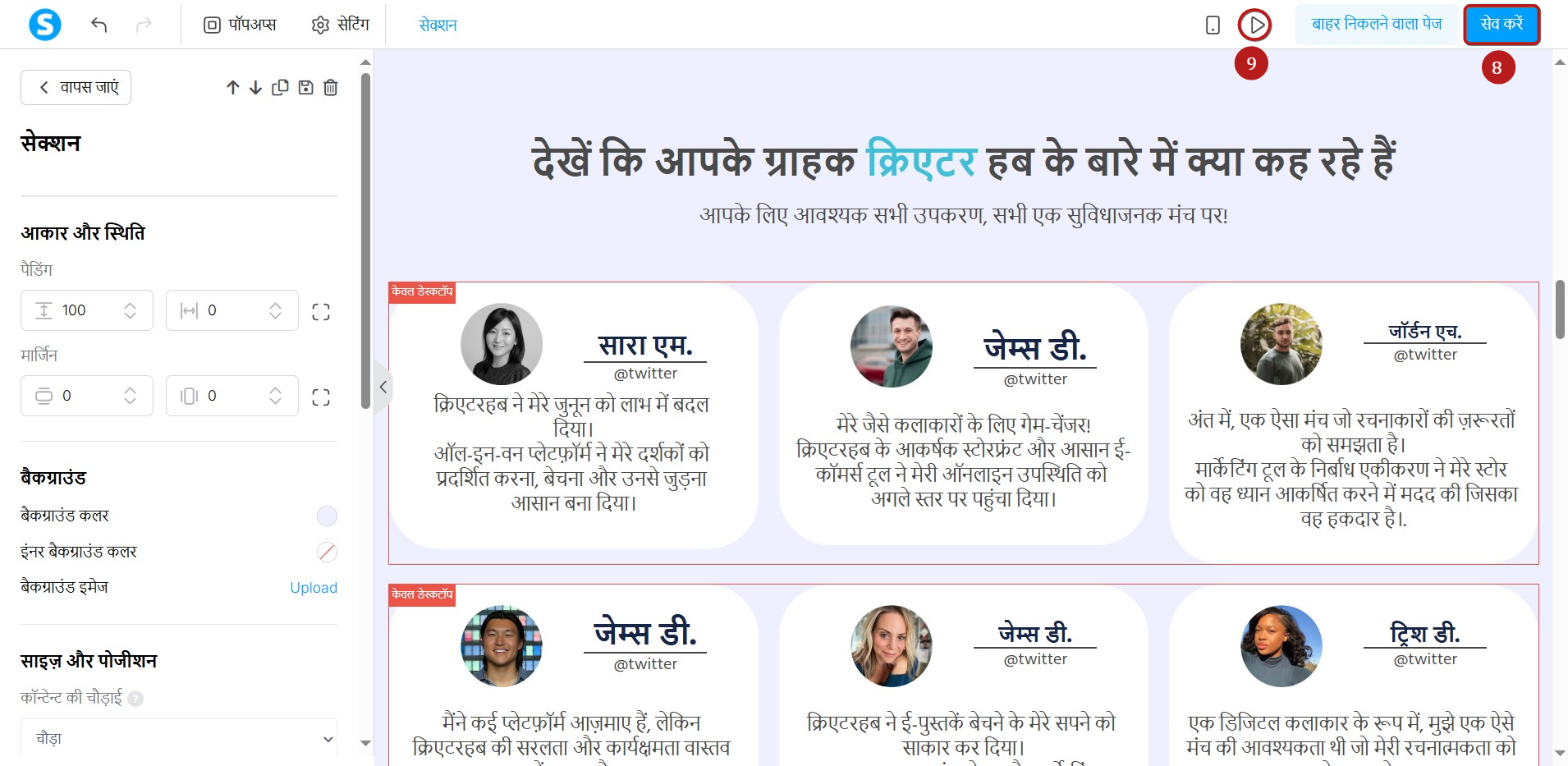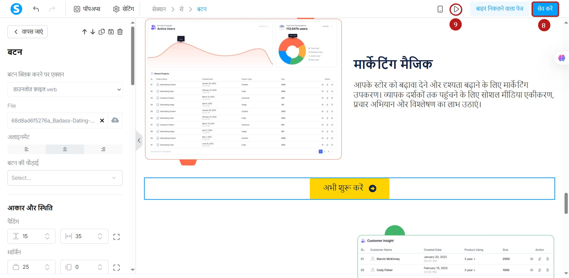 सहेजें बटन (8) पर क्लिक करके अपने पेज को सहेजें, और फिरप्रीव्यू बटन (9) पर क्लिक करें।