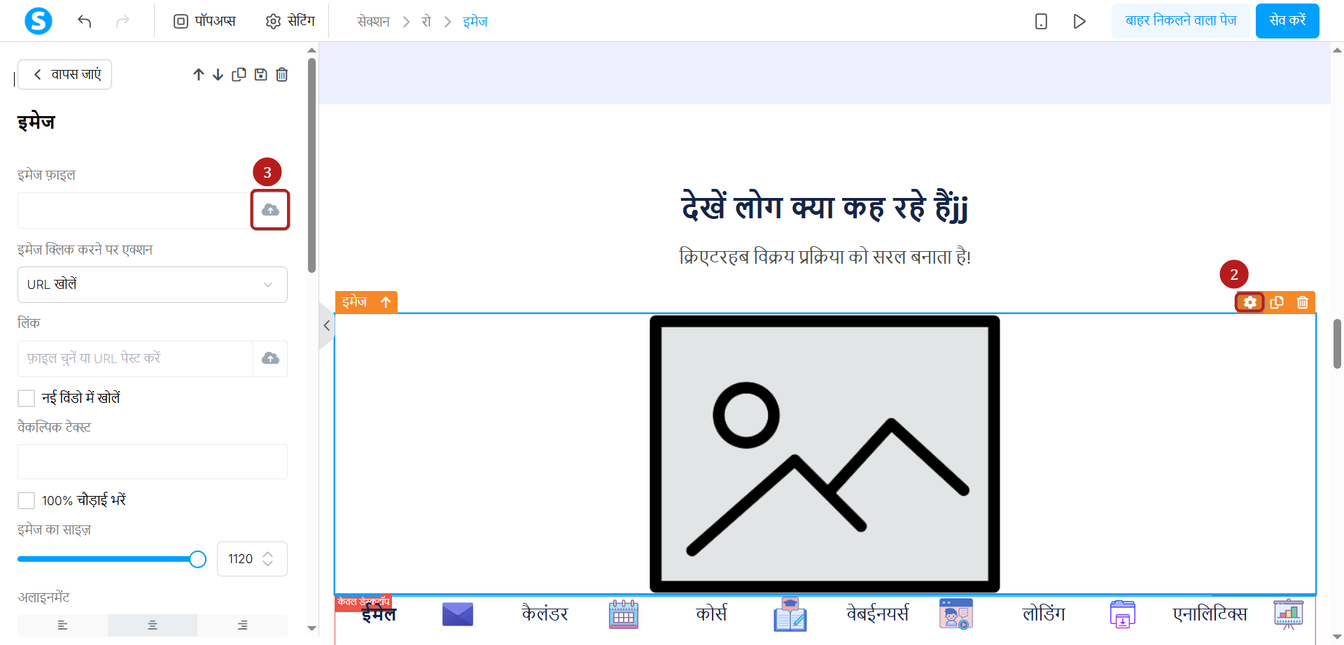 बाईं ओर एलिमेंट पैनल खोलने के लिए सेटिंग्स बटन (2) पर क्लिक करें। फिर अपनी छवि सम्मिलित करने के लिए क्लाउड-आकार का बटन क्लिक करें (3)।