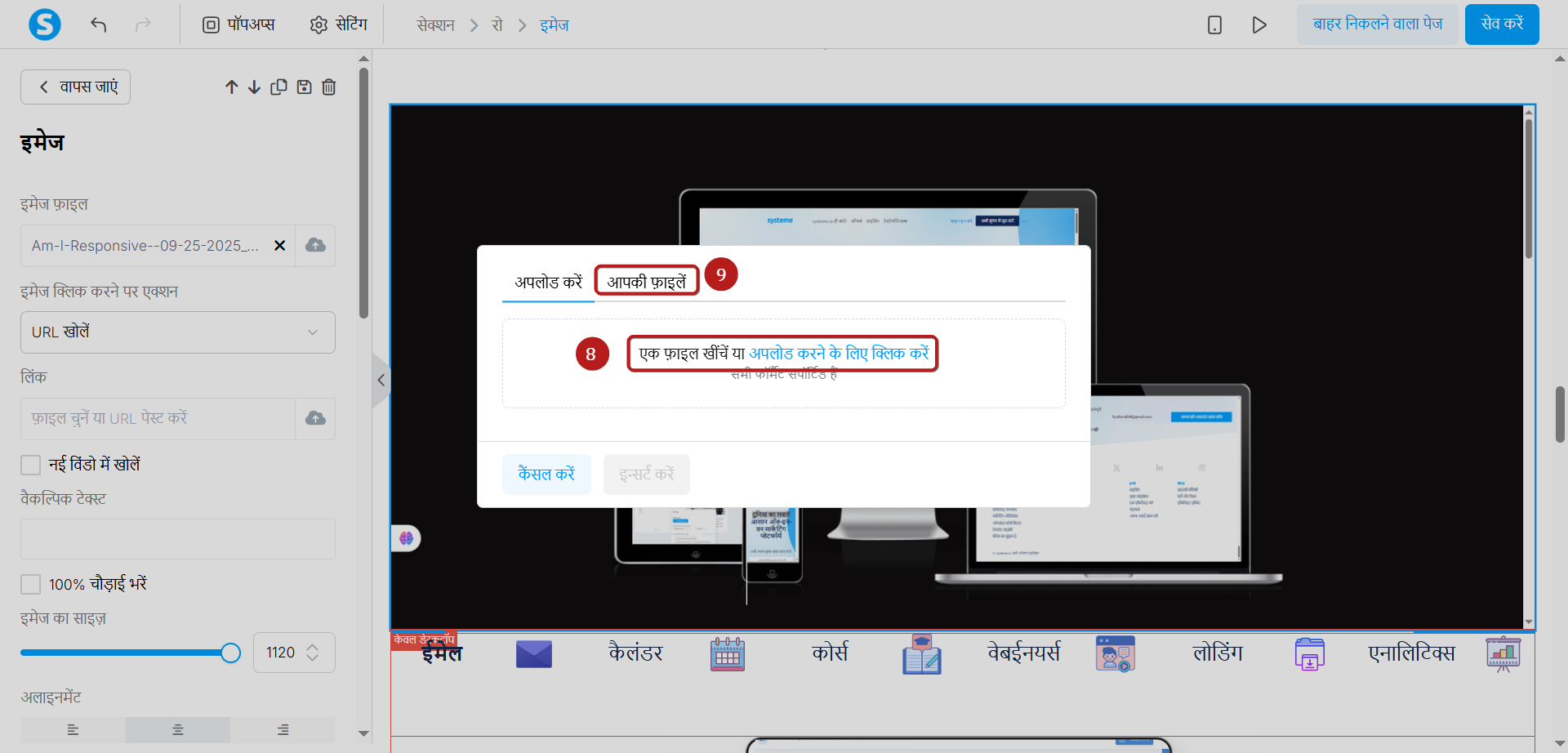 यदि आप पसंद करते हैं, तो आप एक ऐसी फ़ाइल भी चुन सकते हैं जो पहले से ही आपके Systeme.io खाते (9) में सहेजी हो।
