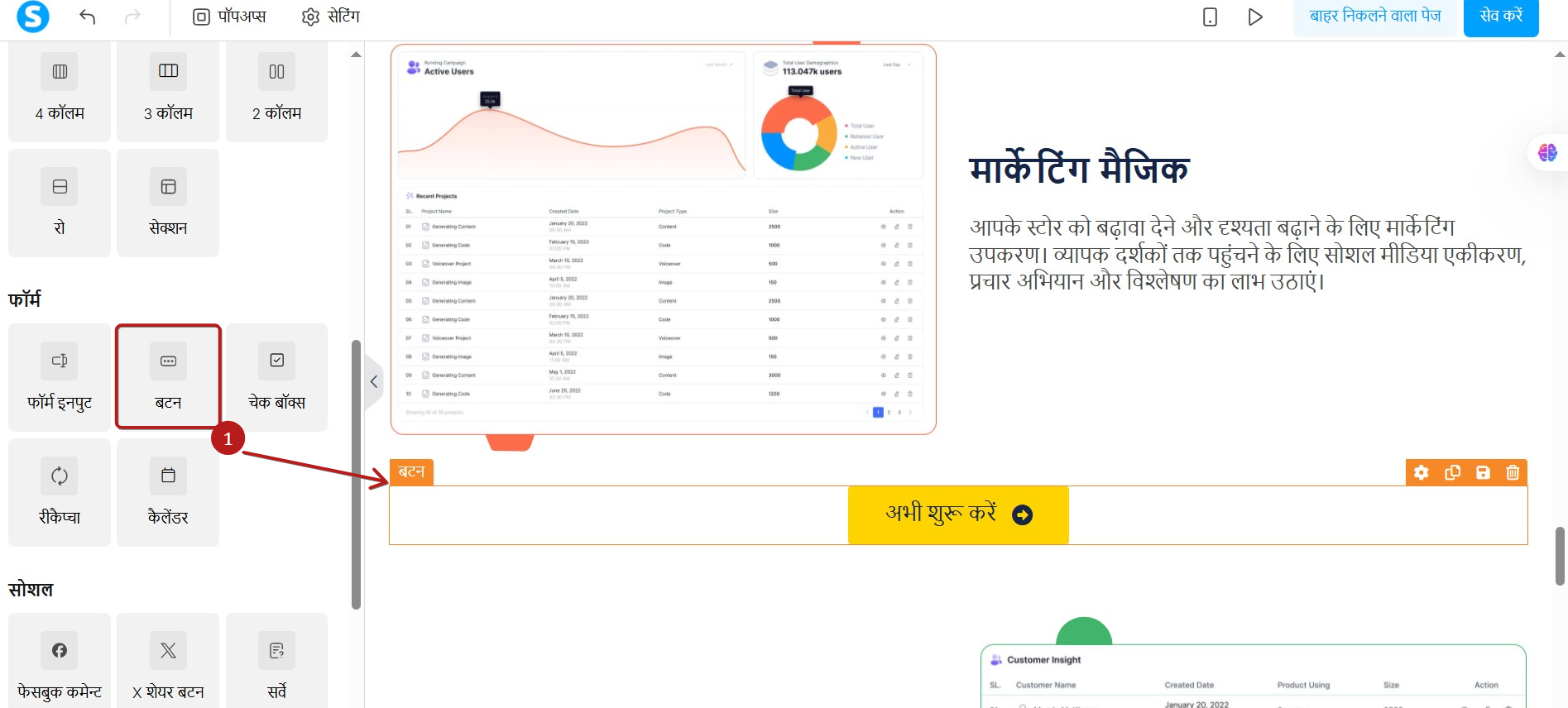 बटन तत्व को खींचें और इसे अपने पृष्ठ (1) पर छोड़ें।