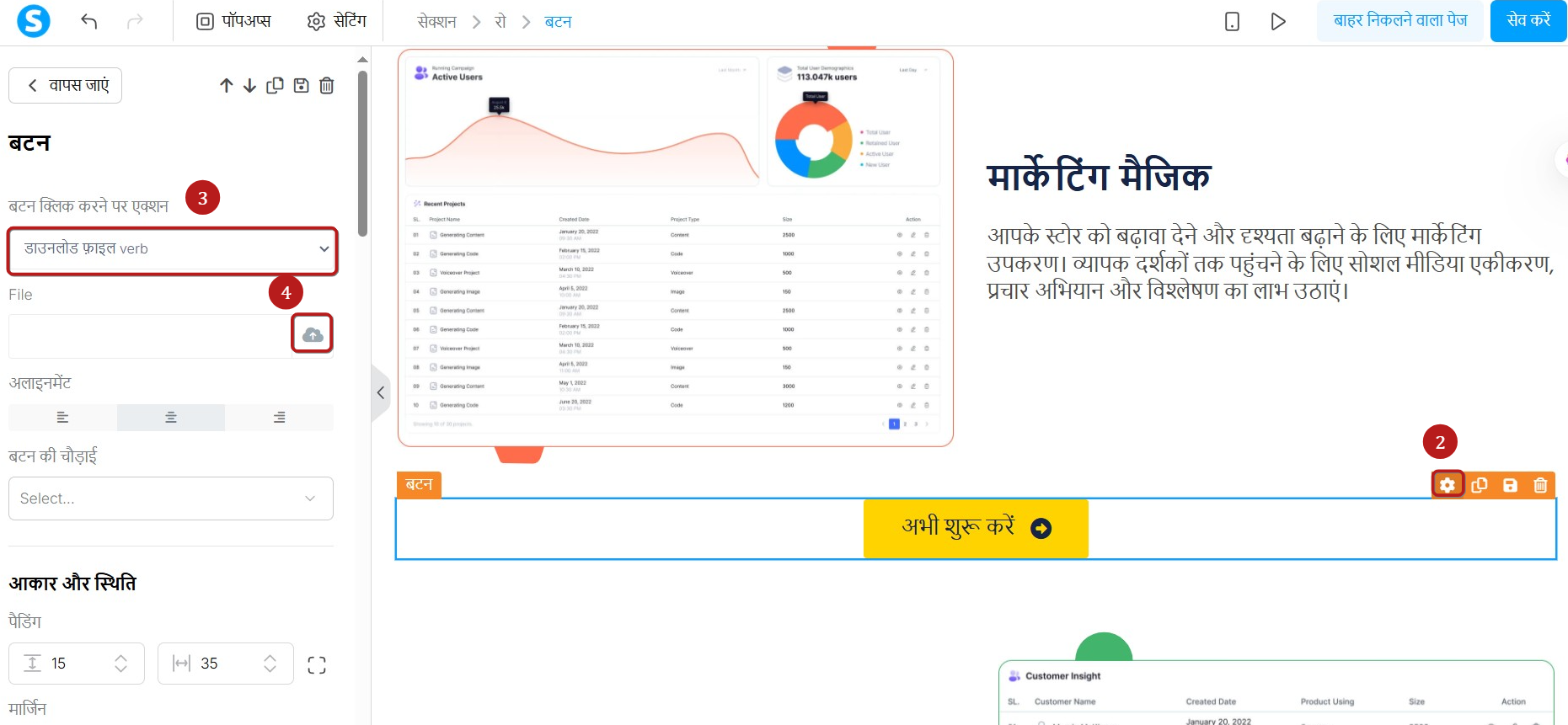 अपने बटन पैरामीटर (2) पर क्लिक करें, फ़ाइल डाउनलोड करें बटन क्रिया (3) चुनें, फिर क्लाउड-आकार वाले बटन (4) पर क्लिक करके एक फ़ाइल डालें।