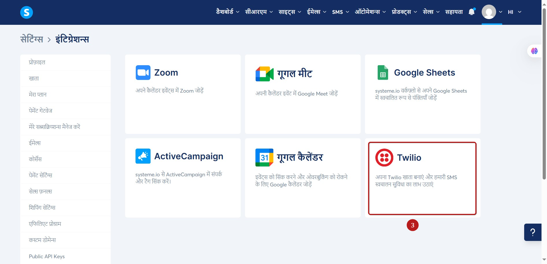 एक बार इंटीग्रेशन में, इसे अपने systeme.io खाते से कनेक्ट करने के लिए ट्विलियो (3) पर क्लिक करें।