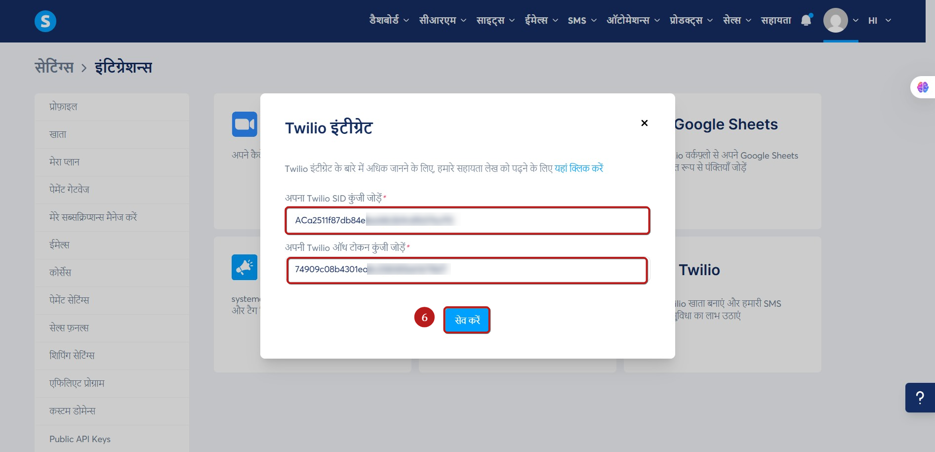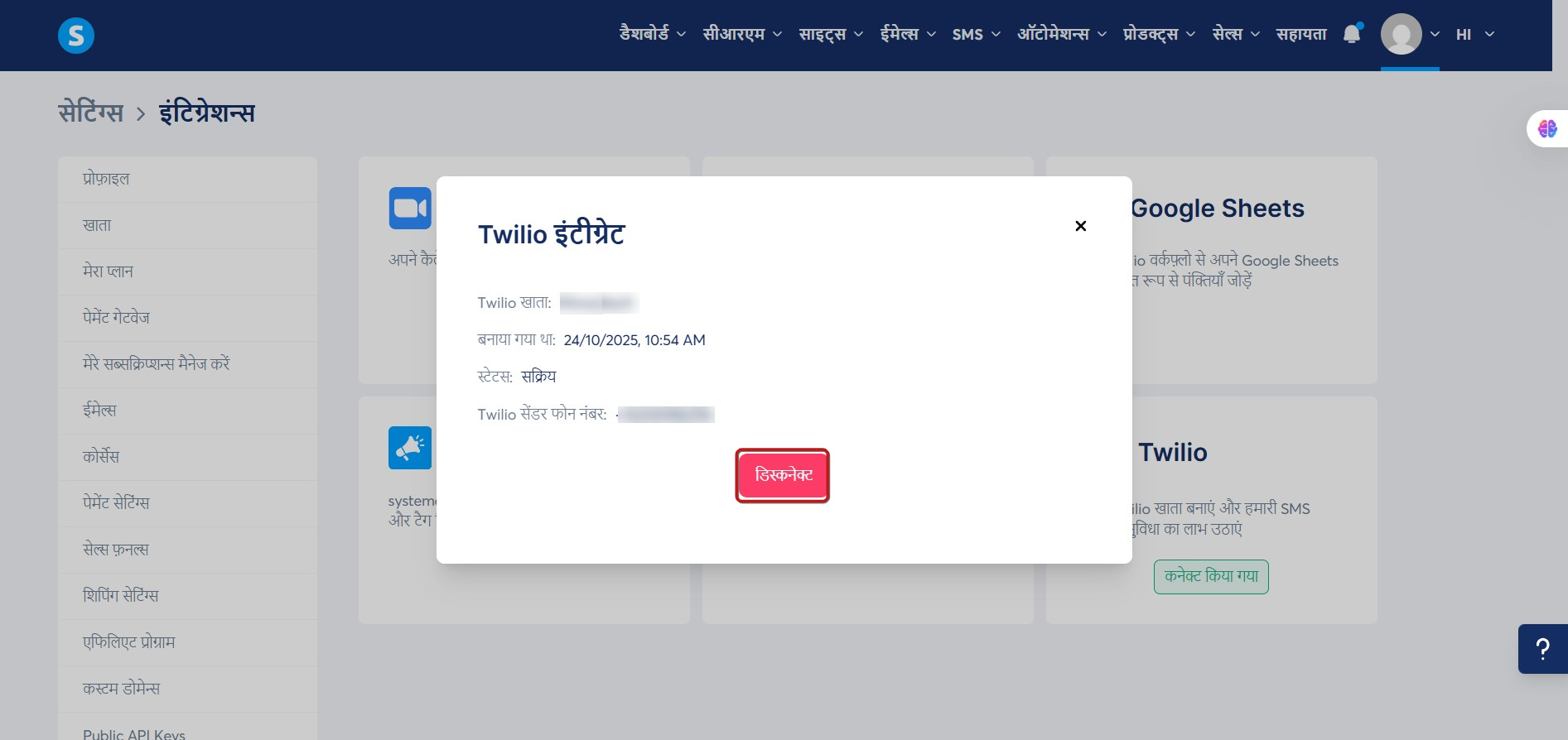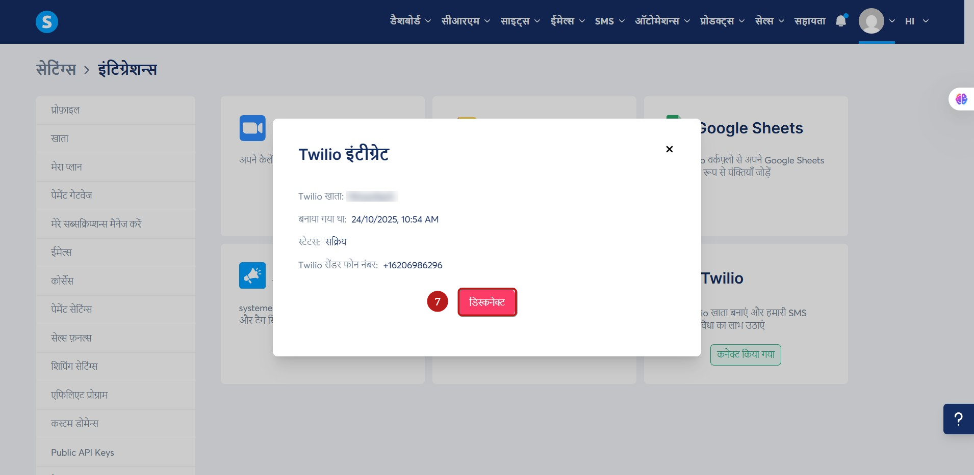 बाद में, Twilio पर क्लिक करके, आप ऊपर उल्लिखित अपने खाते की जानकारी देख पाएंगे, और यदि आवश्यक हो तो डिस्कनेक्ट (7) पर क्लिक करके अपने Twilio खाते को डिस्कनेक्ट करने का विकल्प होगा।